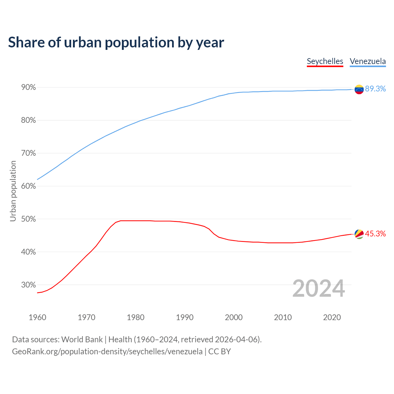 From 2004 to 2024, the share of urban population changed from 42.9% to 45.3% in the Seychelles and from 88.6% to 89.3% in Venezuela.