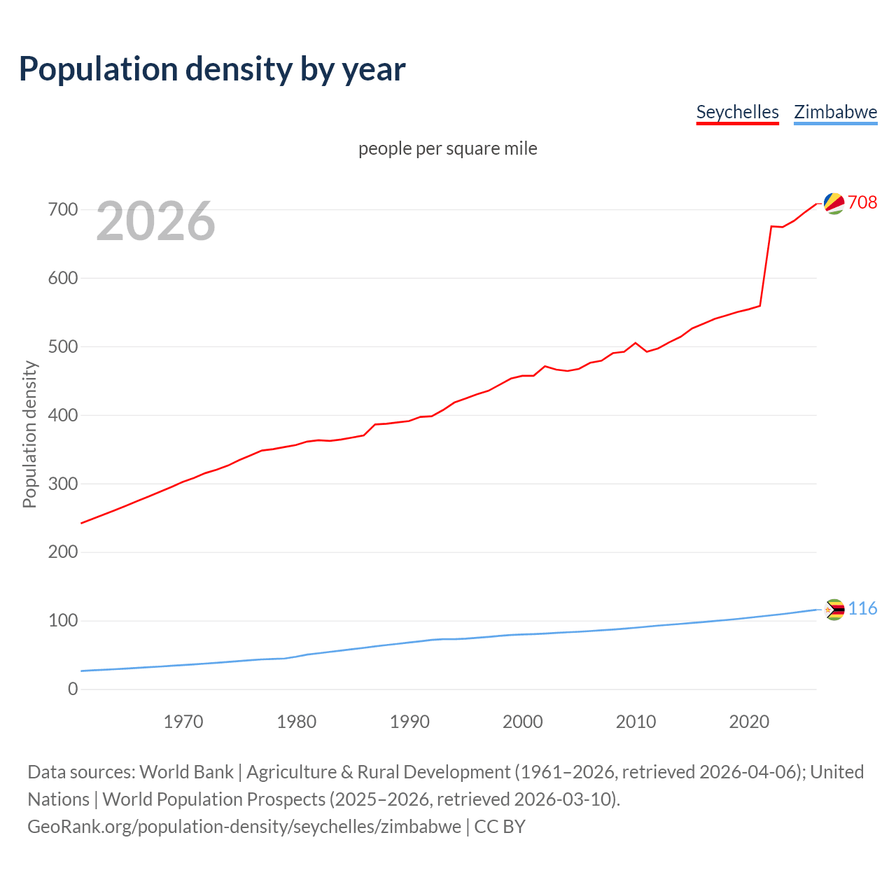 From 2006 to 2026, population density in the Seychelles increased by 48.7%, compared to a 36.7% growth in Zimbabwe.