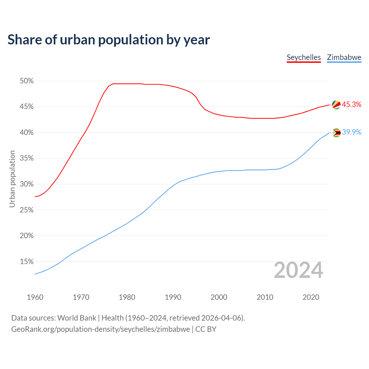 From 2004 to 2024, the share of urban population changed from 42.9% to 45.3% in the Seychelles and from 32.6% to 39.9% in Zimbabwe.