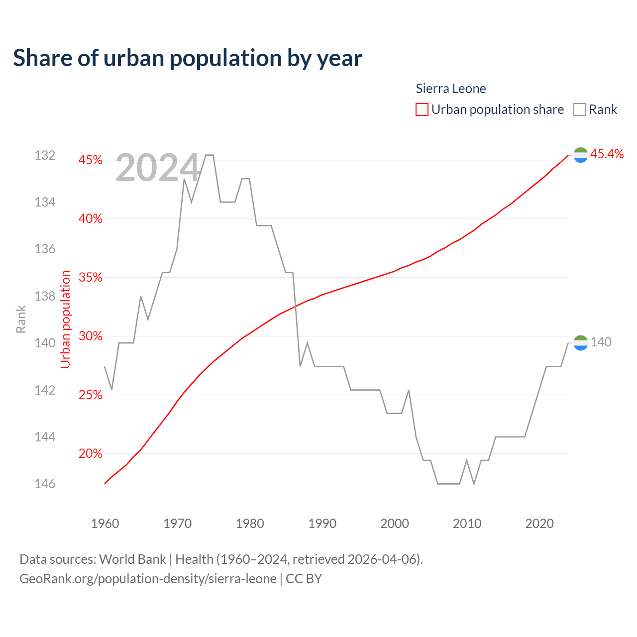 This chart shows the share of urban population in Sierra Leone from 1960 to 2024: 17.4% lived in urban areas in 1960, 35.5% in 2000, and 45.4% in 2024.