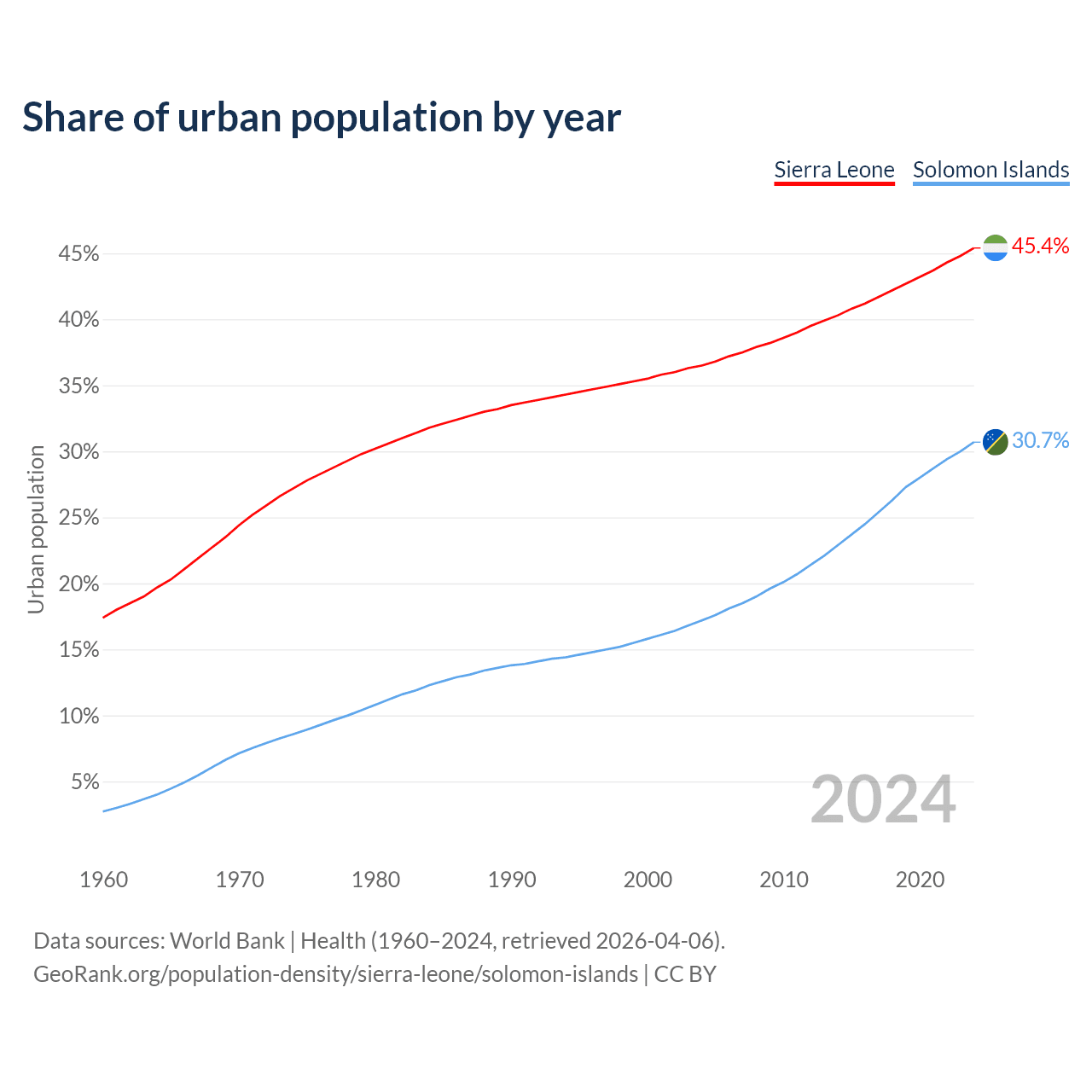 From 2004 to 2024, the share of urban population changed from 36.5% to 45.4% in Sierra Leone and from 17.2% to 30.7% in the Solomon Islands.