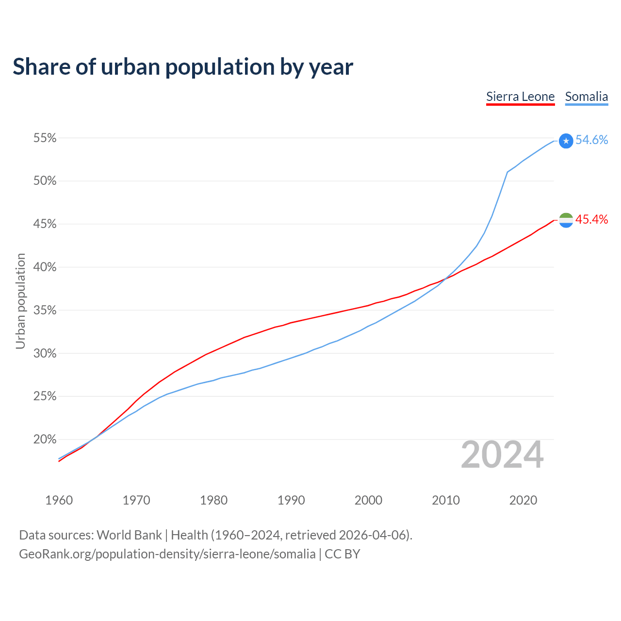 From 2004 to 2024, the share of urban population changed from 36.5% to 45.4% in Sierra Leone and from 35% to 54.6% in Somalia.