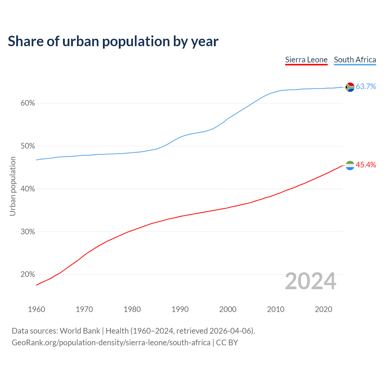 From 2004 to 2024, the share of urban population changed from 36.5% to 45.4% in Sierra Leone and from 59.1% to 63.7% in South Africa.