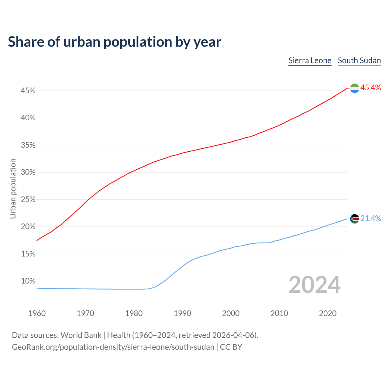 From 2004 to 2024, the share of urban population changed from 36.5% to 45.4% in Sierra Leone and from 16.8% to 21.4% in South Sudan.