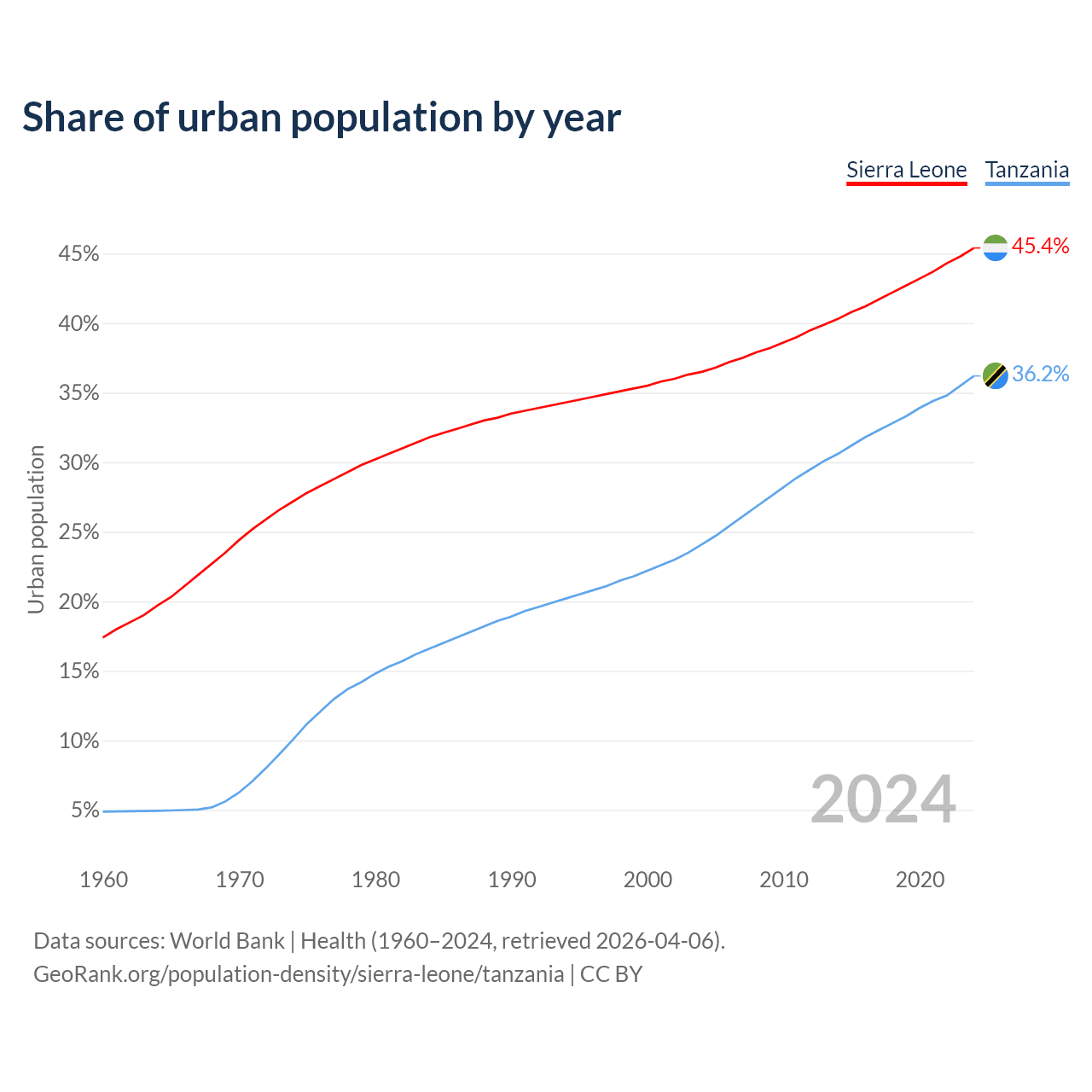 From 2004 to 2024, the share of urban population changed from 36.5% to 45.4% in Sierra Leone and from 24.1% to 36.2% in Tanzania.