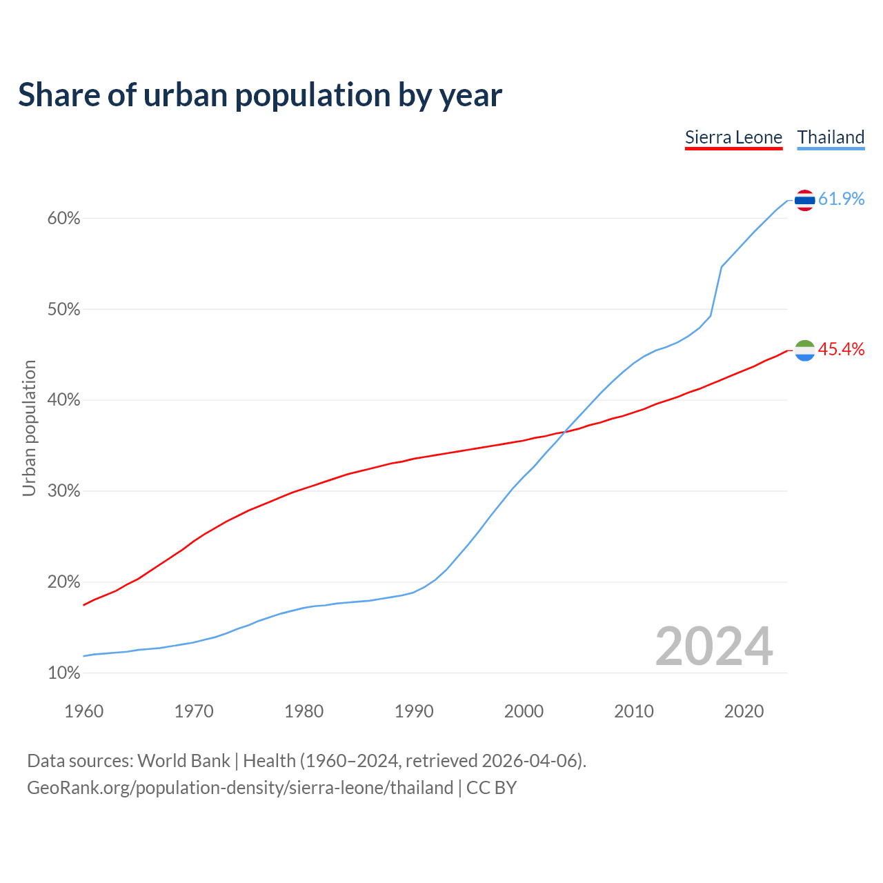 From 2006 to 2026, population density in Sierra Leone increased by 60%, compared to a 7.52% growth in Thailand.