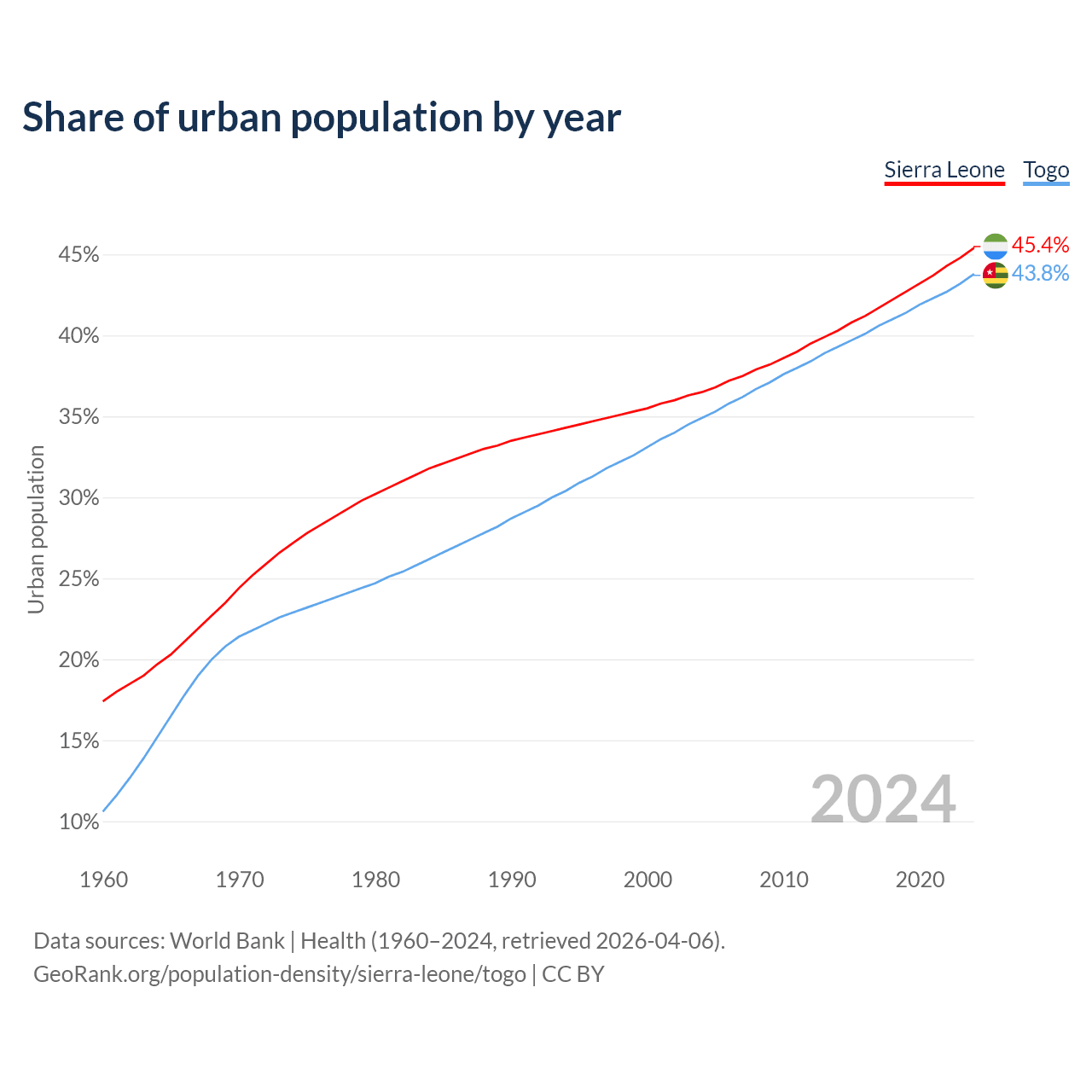 From 2004 to 2024, the share of urban population changed from 36.5% to 45.4% in Sierra Leone and from 34.9% to 43.8% in Togo.