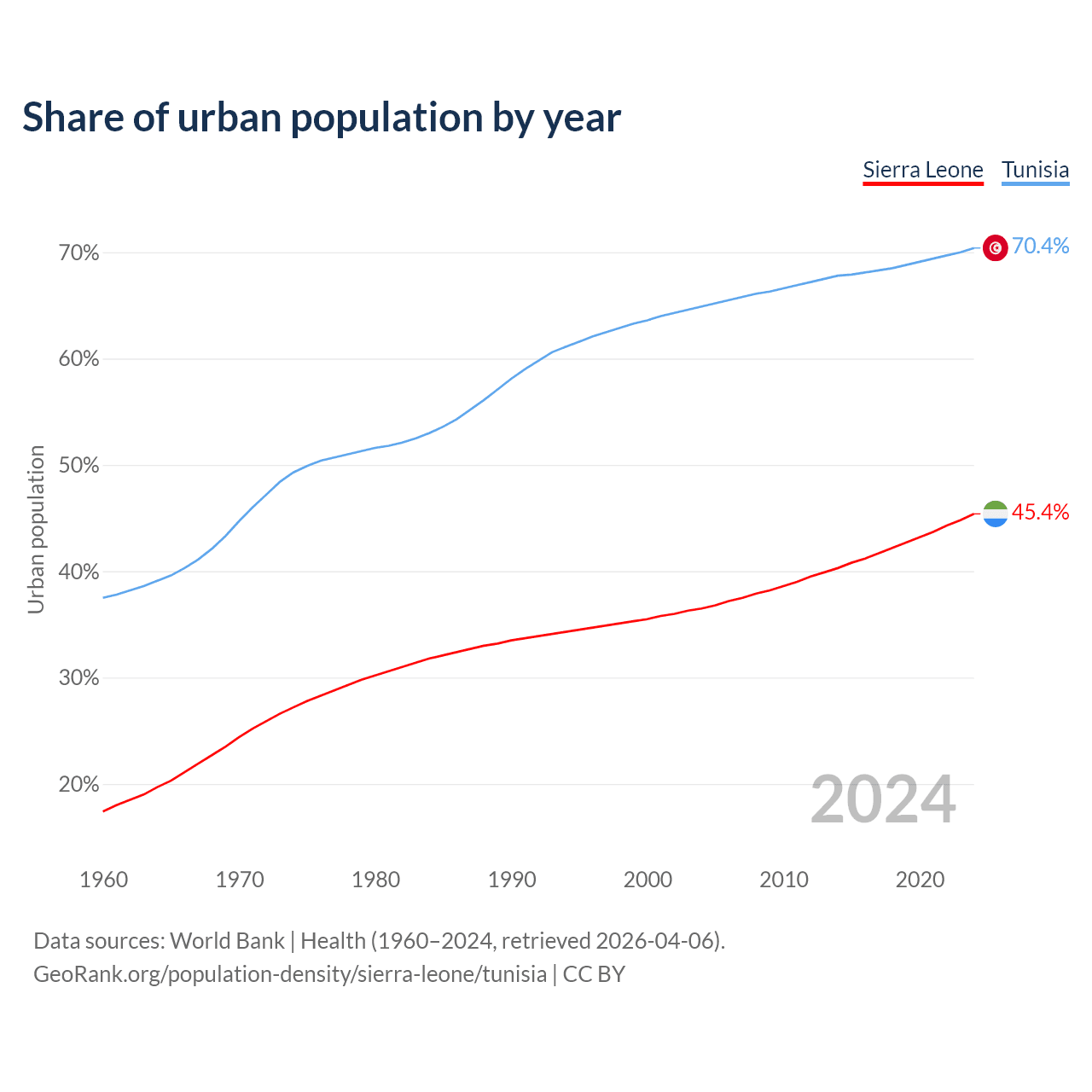 From 2004 to 2024, the share of urban population changed from 36.5% to 45.4% in Sierra Leone and from 64.9% to 70.4% in Tunisia.