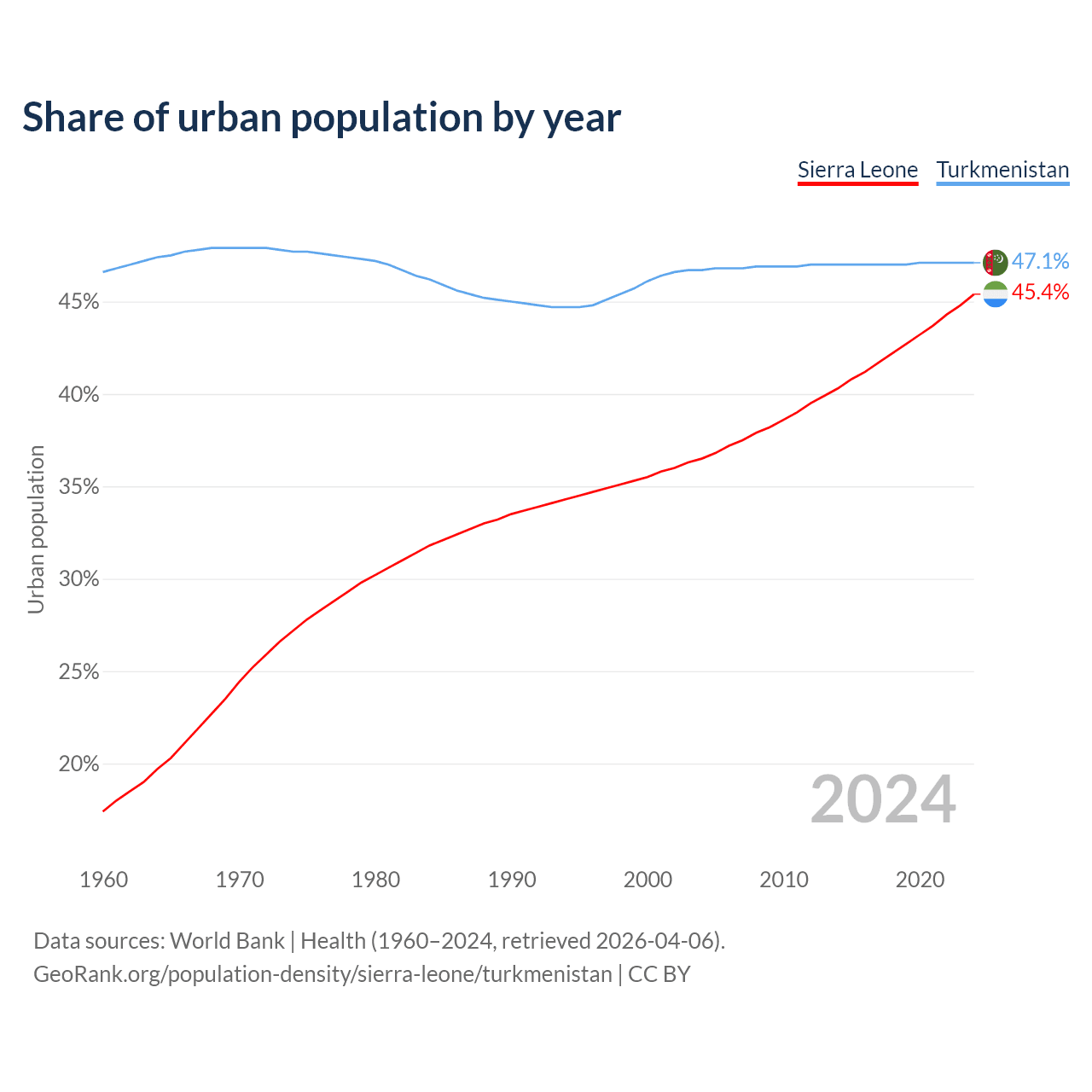 From 2004 to 2024, the share of urban population changed from 36.5% to 45.4% in Sierra Leone and from 46.7% to 47.1% in Turkmenistan.