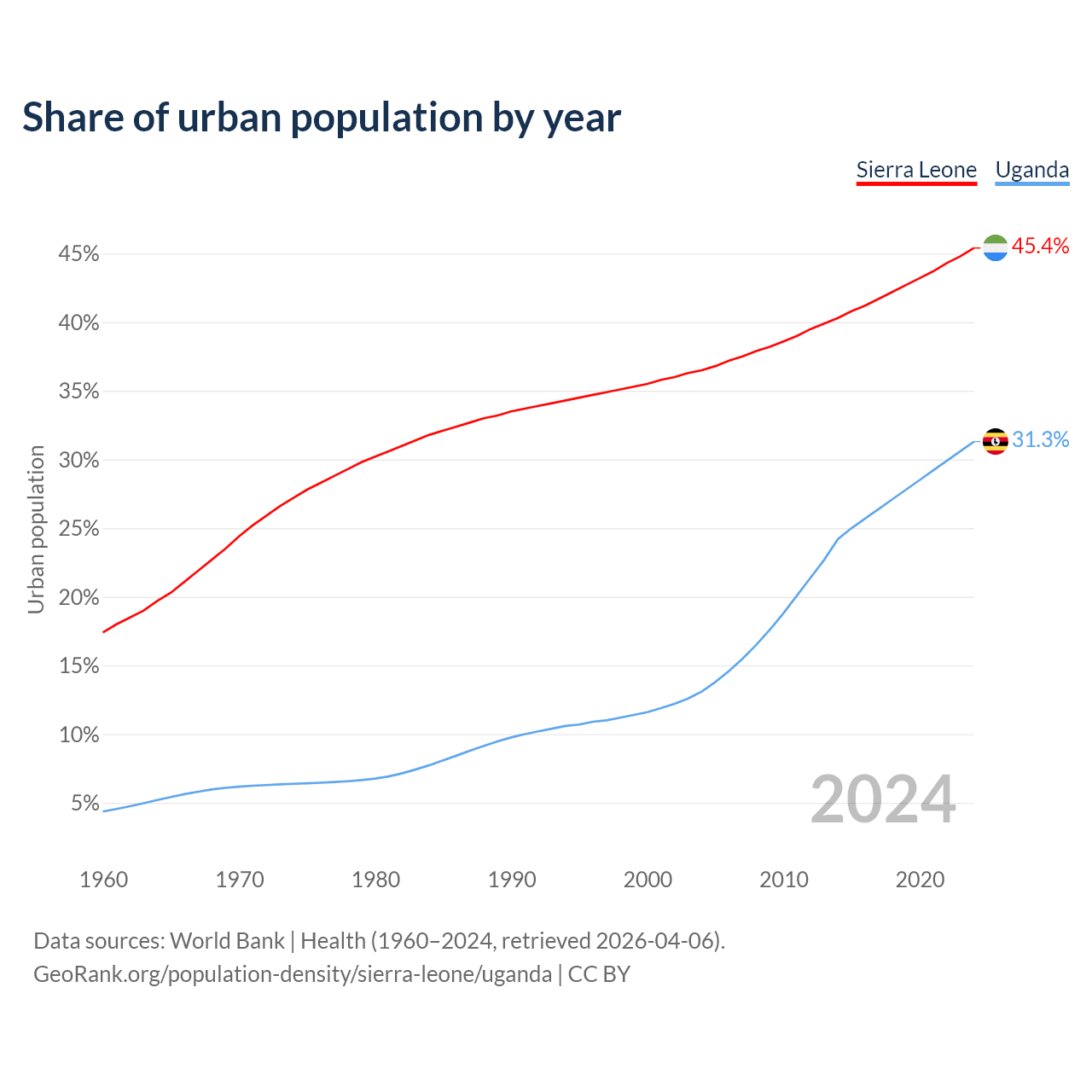 From 2004 to 2024, the share of urban population changed from 36.5% to 45.4% in Sierra Leone and from 13.1% to 31.3% in Uganda.