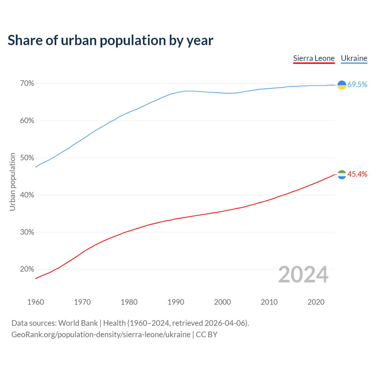 From 2006 to 2026, population density in Sierra Leone increased by 60%, compared to a 15.1% decline in Ukraine.