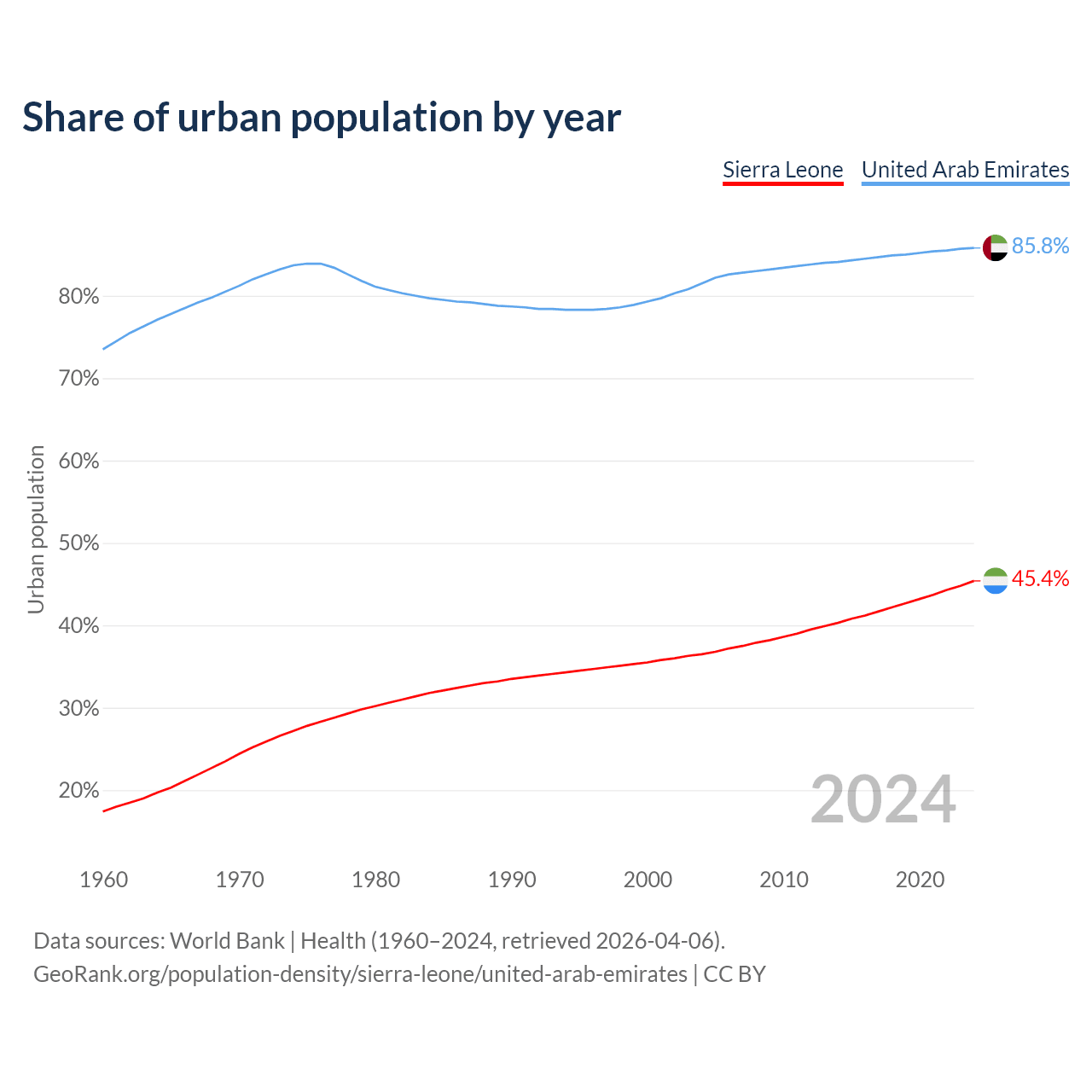 From 2004 to 2024, the share of urban population changed from 36.5% to 45.4% in Sierra Leone and from 81.5% to 85.8% in the United Arab Emirates.
