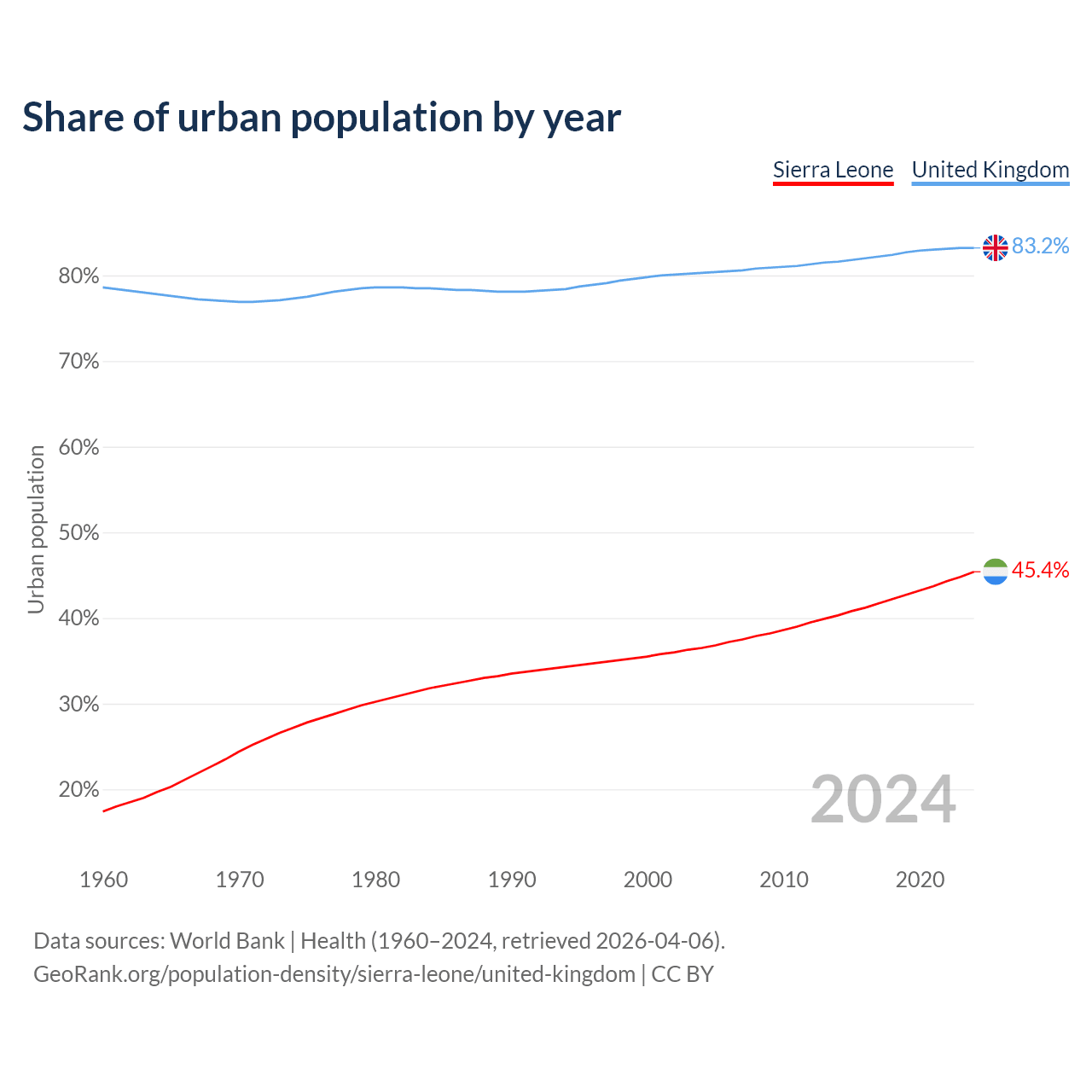 From 2004 to 2024, the share of urban population changed from 36.5% to 45.4% in Sierra Leone and from 80.3% to 83.2% in the United Kingdom.