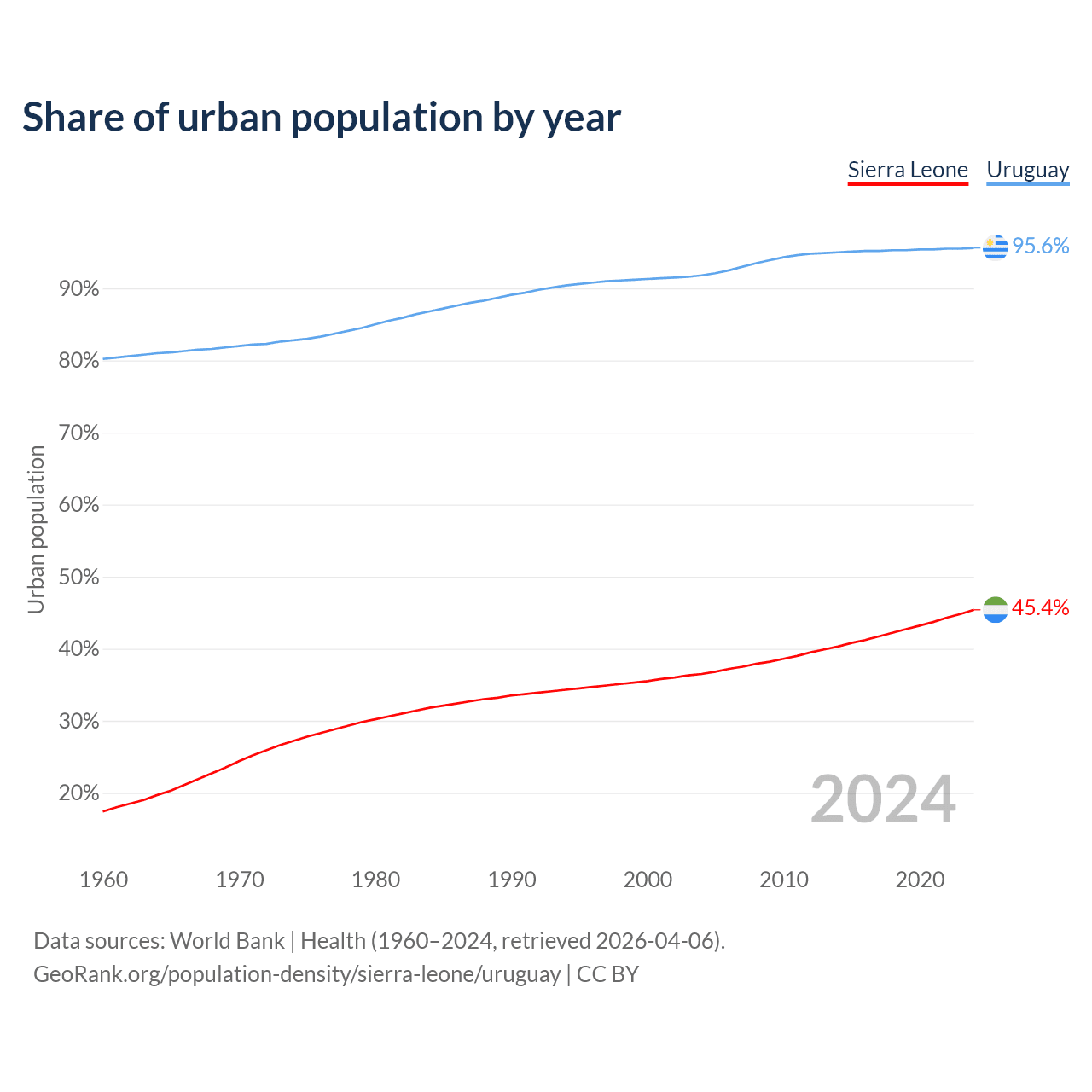 From 2004 to 2024, the share of urban population changed from 36.5% to 45.4% in Sierra Leone and from 91.8% to 95.6% in Uruguay.