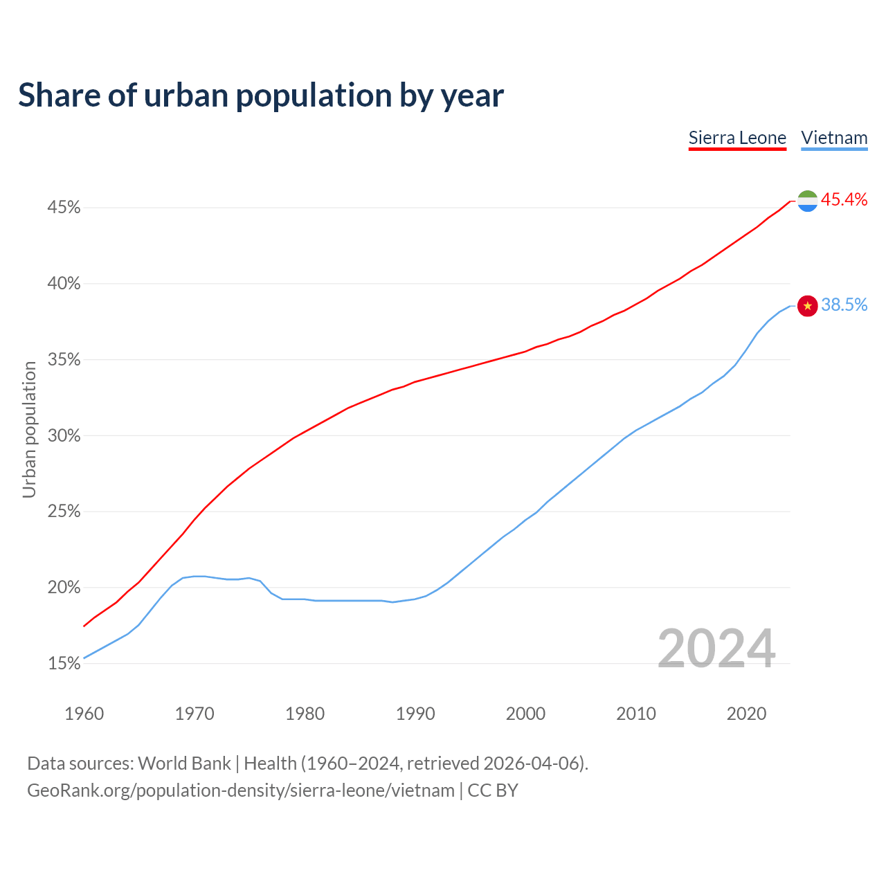 From 2006 to 2026, population density in Sierra Leone increased by 60%, compared to a 24.1% growth in Vietnam.