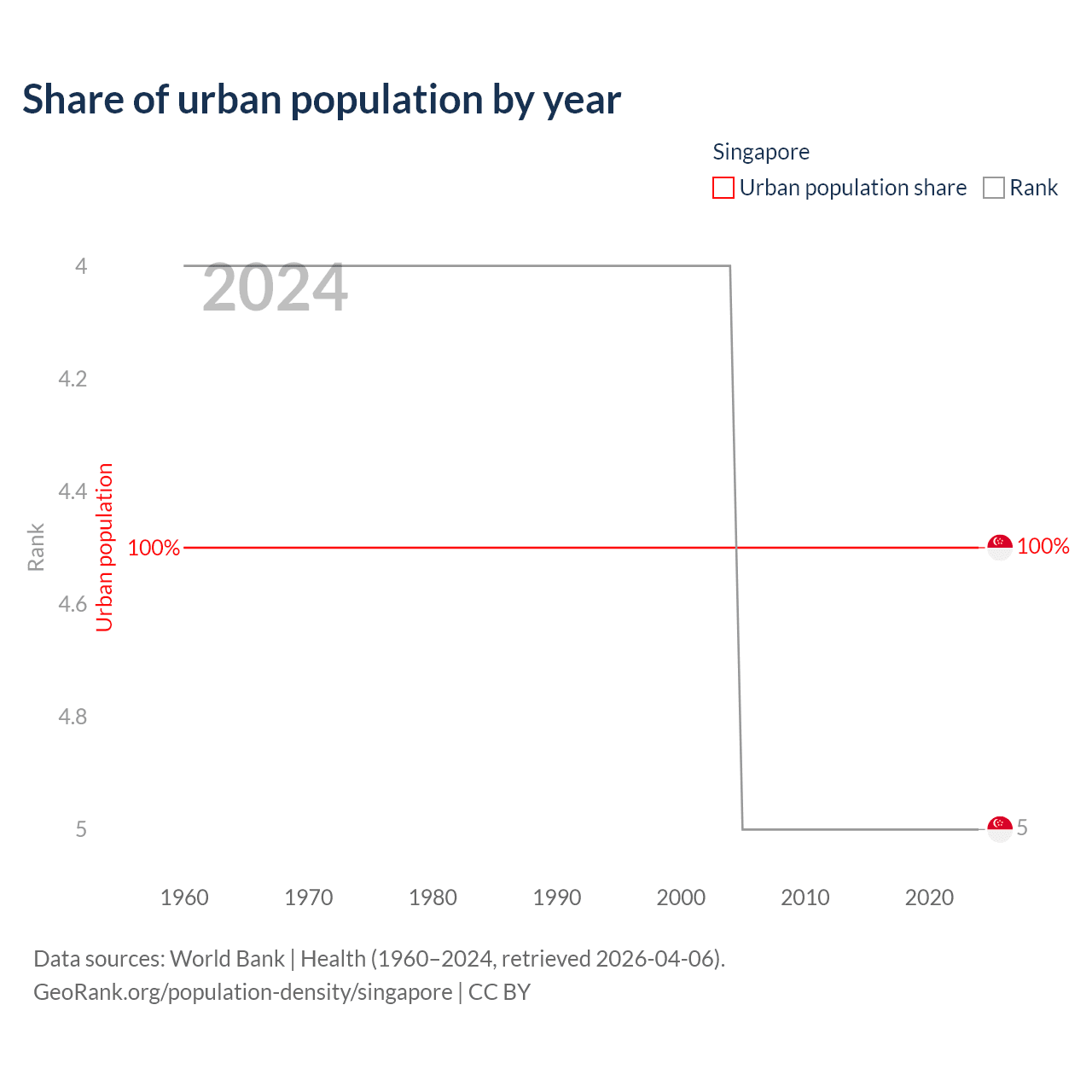 This chart shows the share of urban population in Singapore from 1960 to 2024: 100% lived in urban areas in 1960, 100% in 2000, and 100% in 2024.