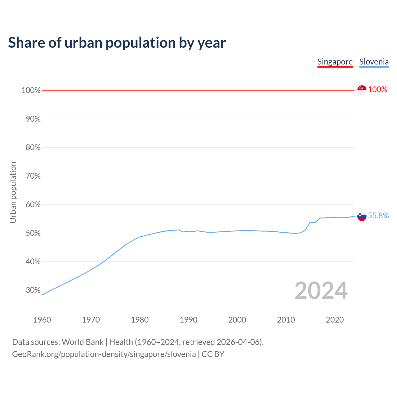From 2004 to 2024, the share of urban population changed from 100% to 100% in Singapore and from 50.7% to 55.8% in Slovenia.