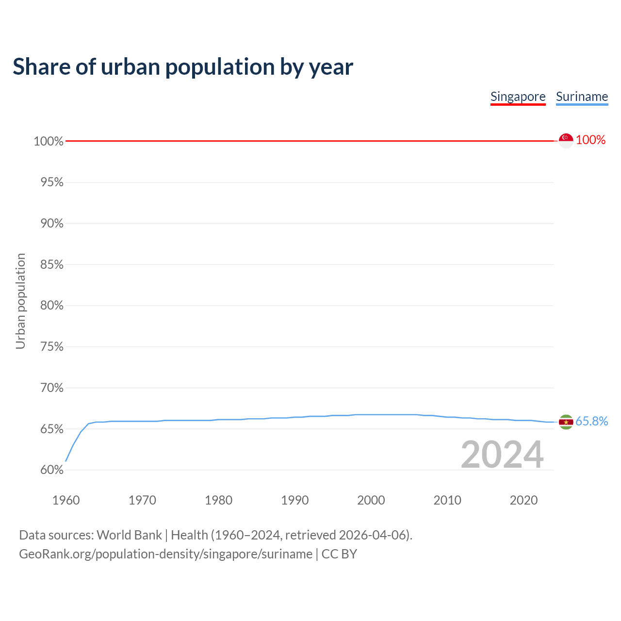 From 2004 to 2024, the share of urban population changed from 100% to 100% in Singapore and from 66.7% to 65.8% in Suriname.
