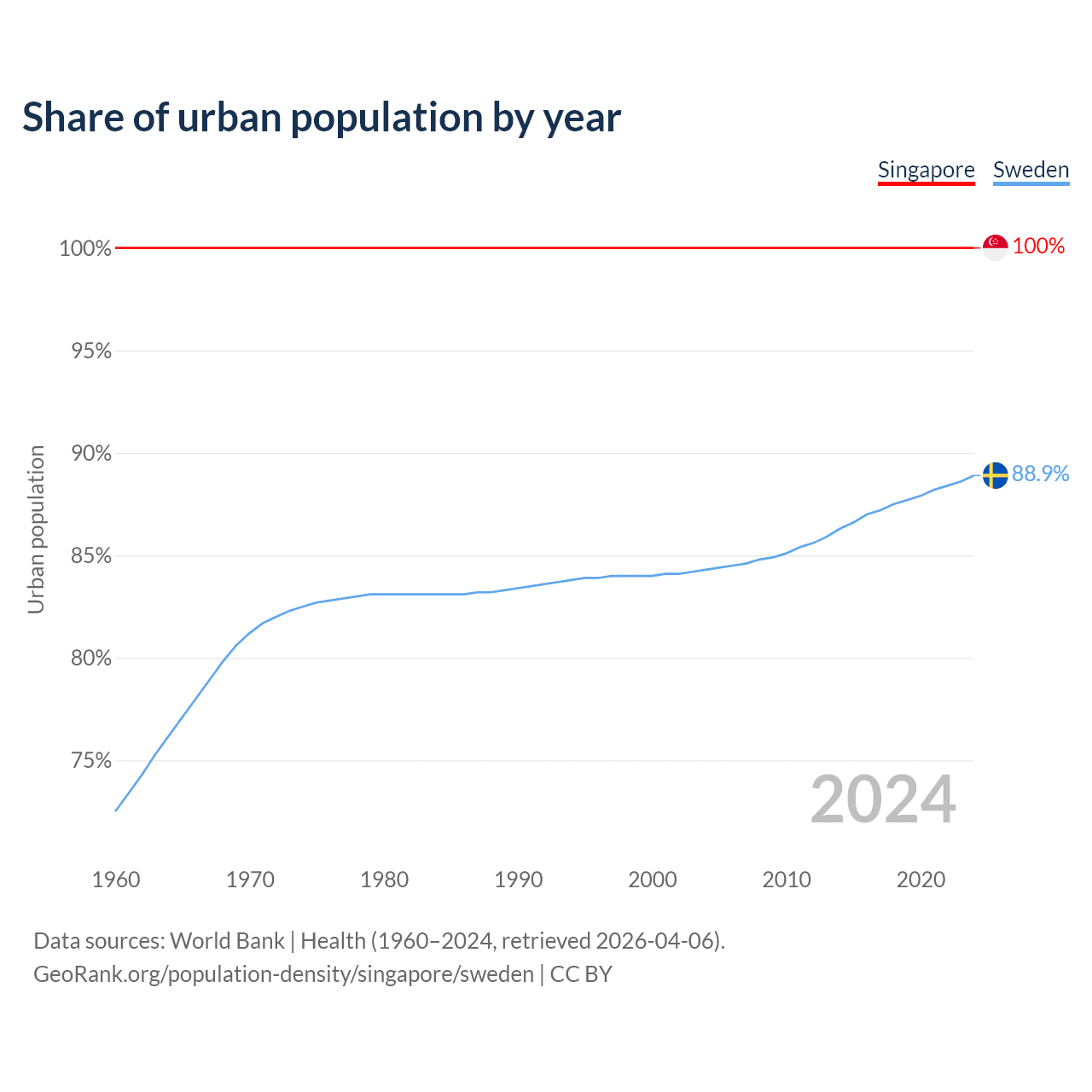 From 2004 to 2024, the share of urban population changed from 100% to 100% in Singapore and from 84.3% to 88.9% in Sweden.