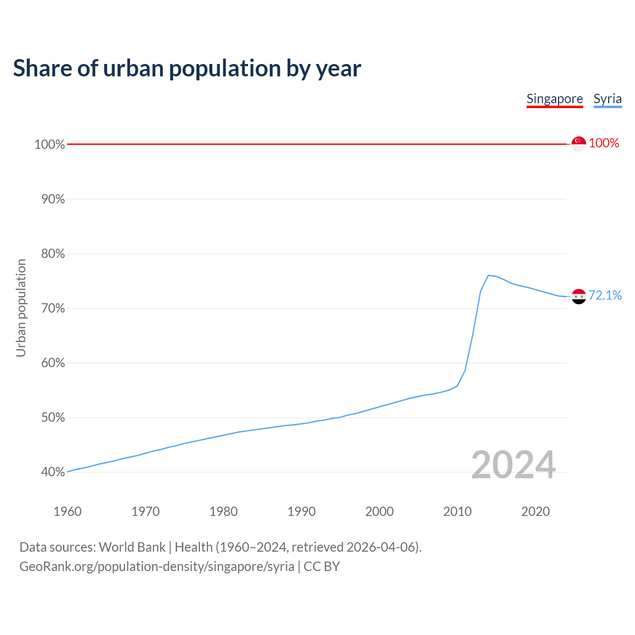 From 2004 to 2024, the share of urban population changed from 100% to 100% in Singapore and from 53.5% to 72.1% in Syria.