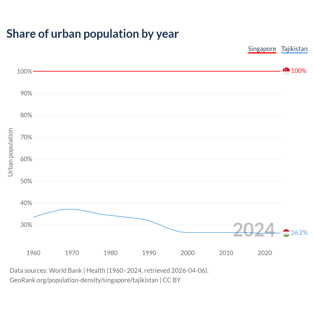 From 2004 to 2024, the share of urban population changed from 100% to 100% in Singapore and from 26.5% to 26.2% in Tajikistan.