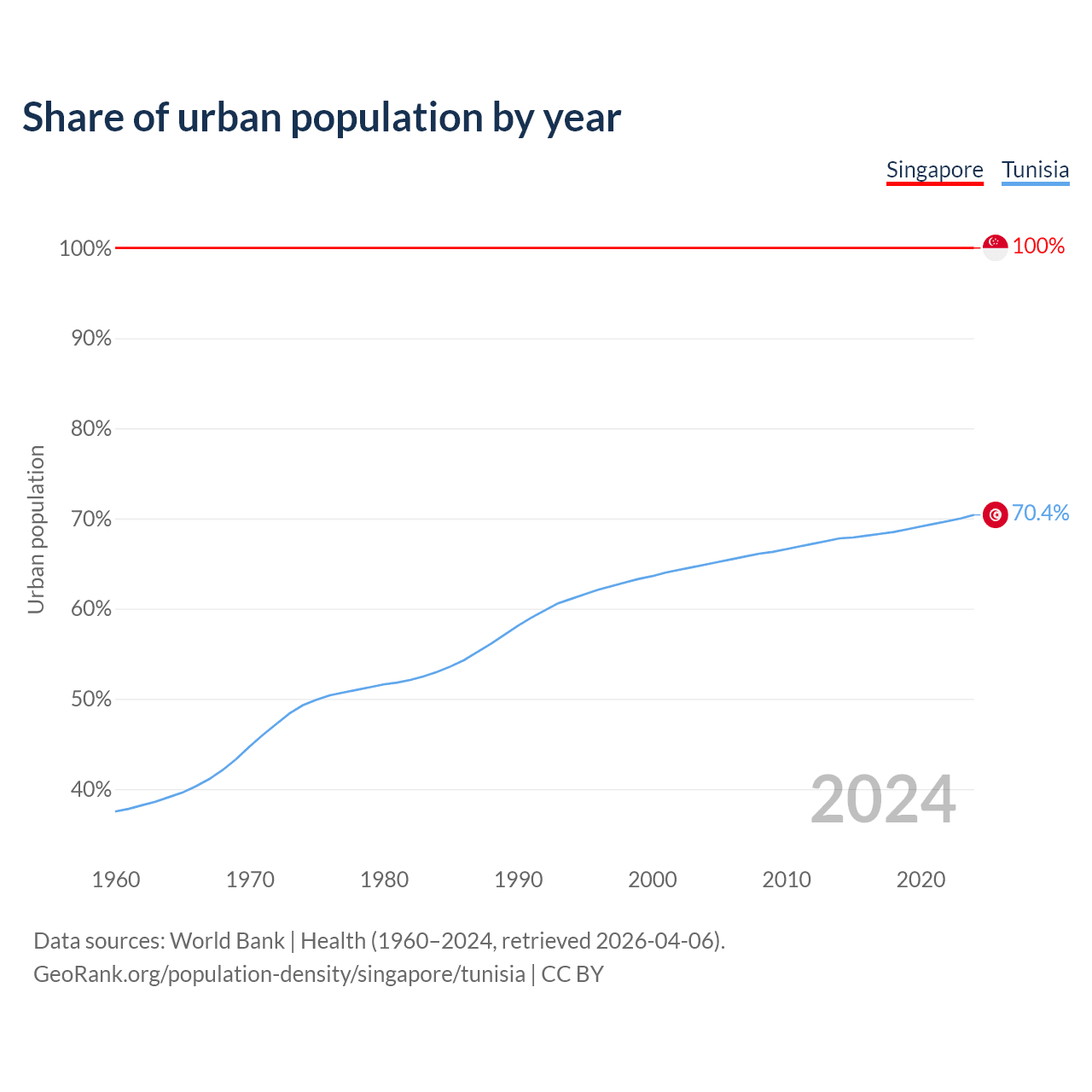 From 2004 to 2024, the share of urban population changed from 100% to 100% in Singapore and from 64.9% to 70.4% in Tunisia.