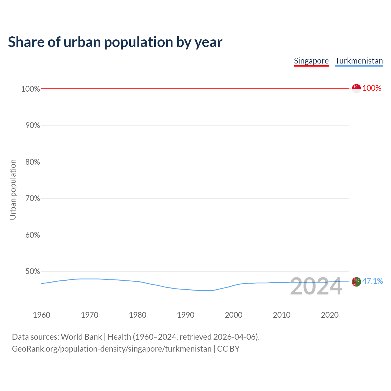 From 2004 to 2024, the share of urban population changed from 100% to 100% in Singapore and from 46.7% to 47.1% in Turkmenistan.