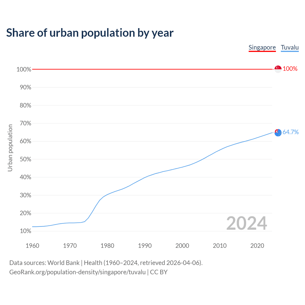 From 2004 to 2024, the share of urban population changed from 100% to 100% in Singapore and from 48.4% to 64.7% in Tuvalu.