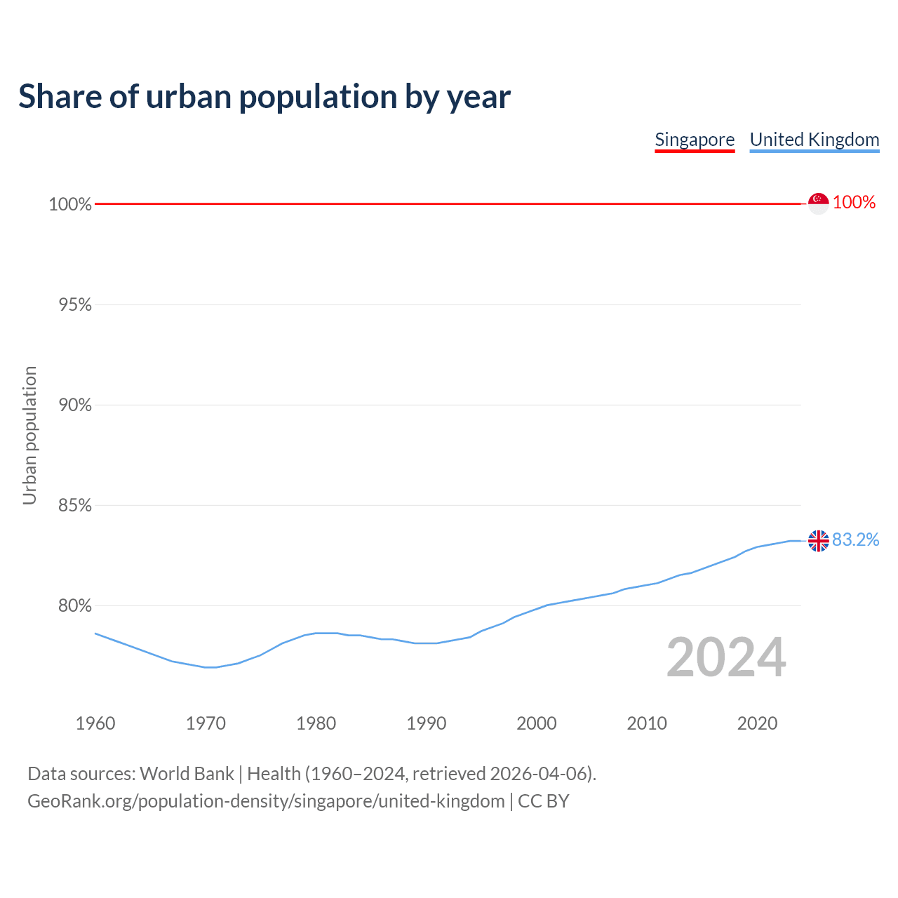 From 2004 to 2024, the share of urban population changed from 100% to 100% in Singapore and from 80.3% to 83.2% in the United Kingdom.