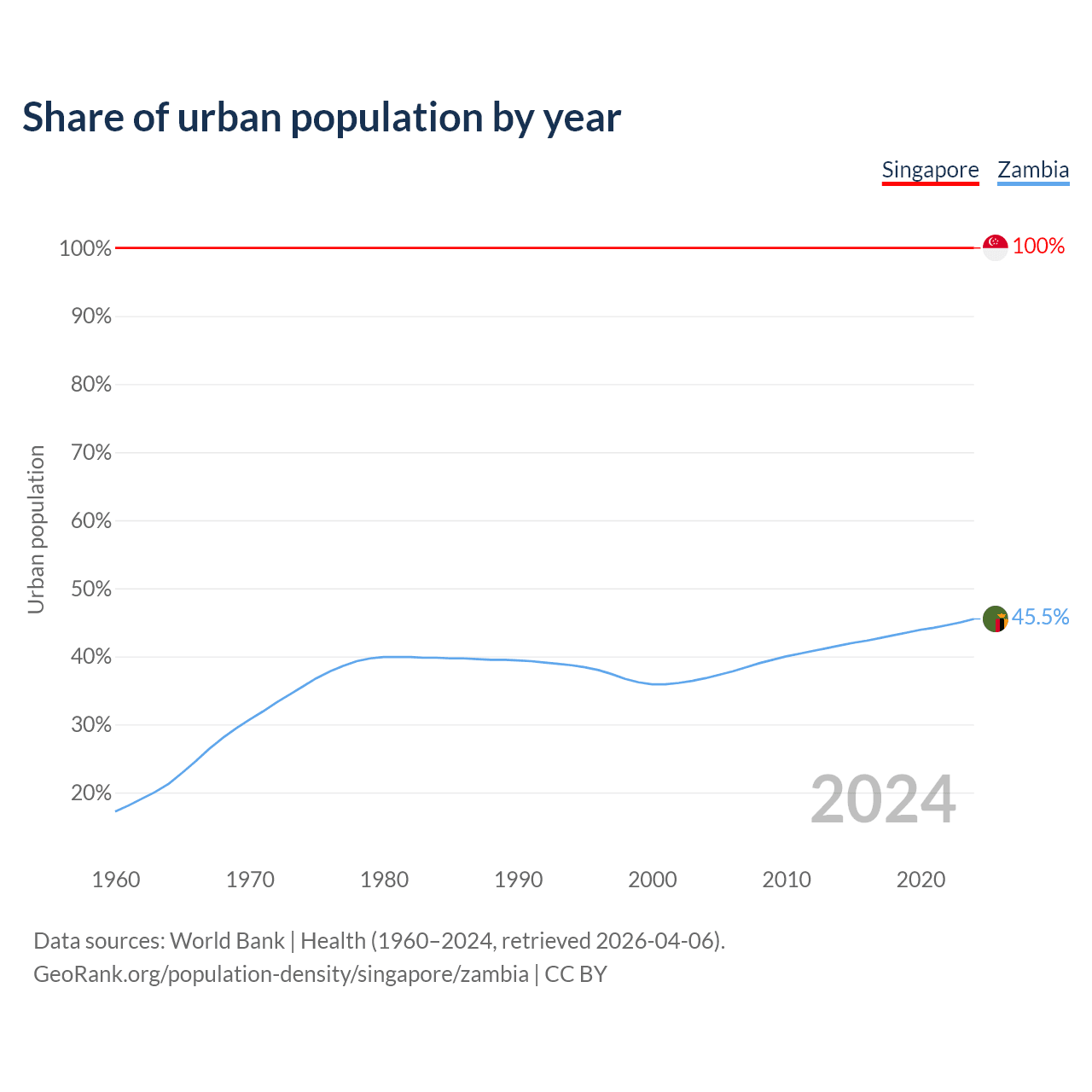 From 2004 to 2024, the share of urban population changed from 100% to 100% in Singapore and from 36.8% to 45.5% in Zambia.