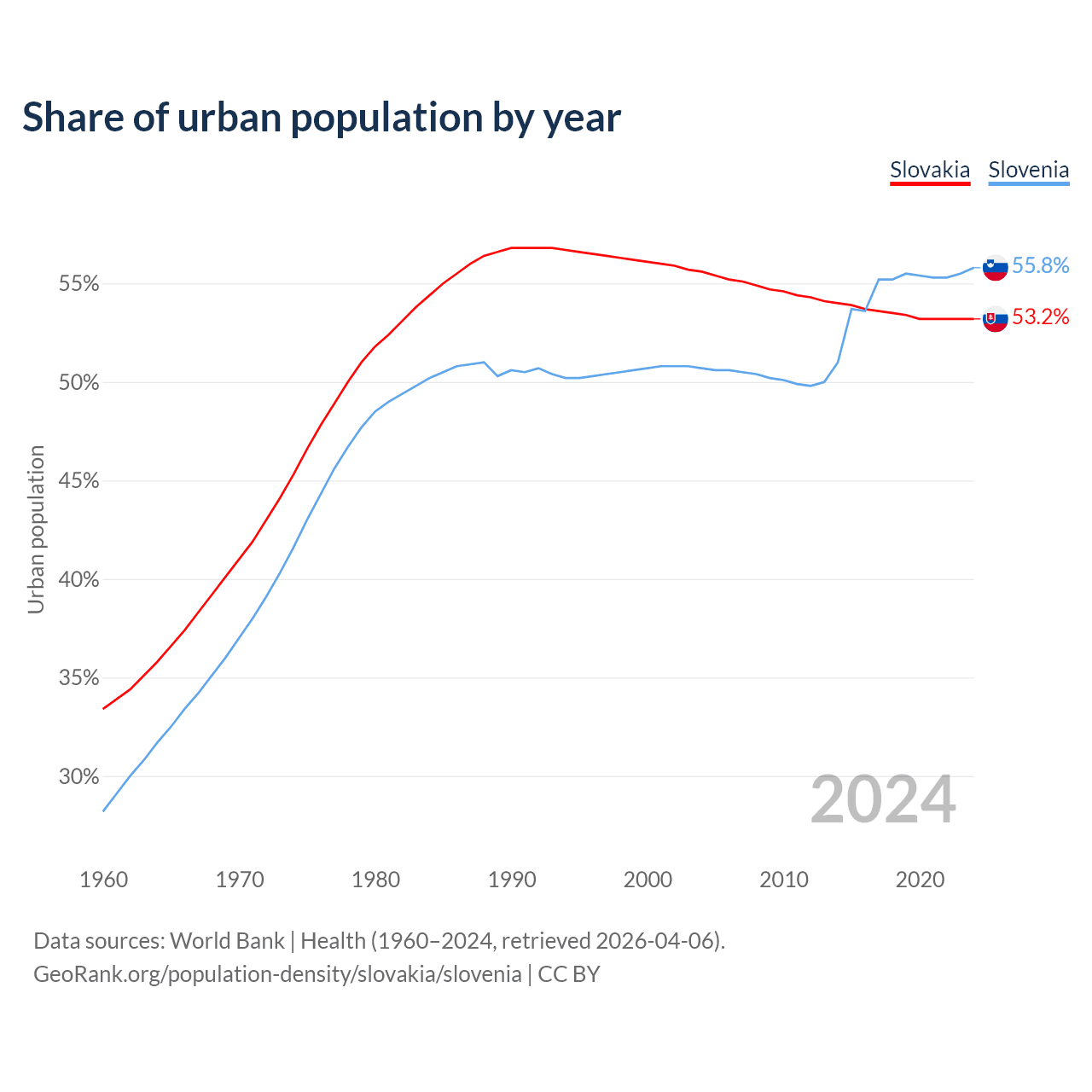 From 2004 to 2024, the share of urban population changed from 55.6% to 53.2% in Slovakia and from 50.7% to 55.8% in Slovenia.