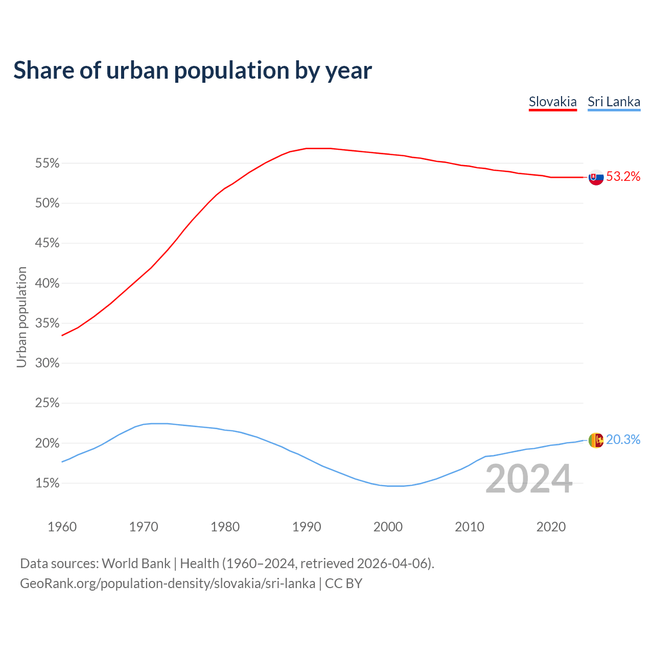 From 2004 to 2024, the share of urban population changed from 55.6% to 53.2% in Slovakia and from 14.9% to 20.3% in Sri Lanka.