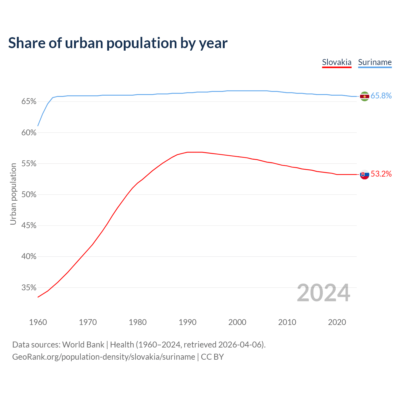 From 2004 to 2024, the share of urban population changed from 55.6% to 53.2% in Slovakia and from 66.7% to 65.8% in Suriname.