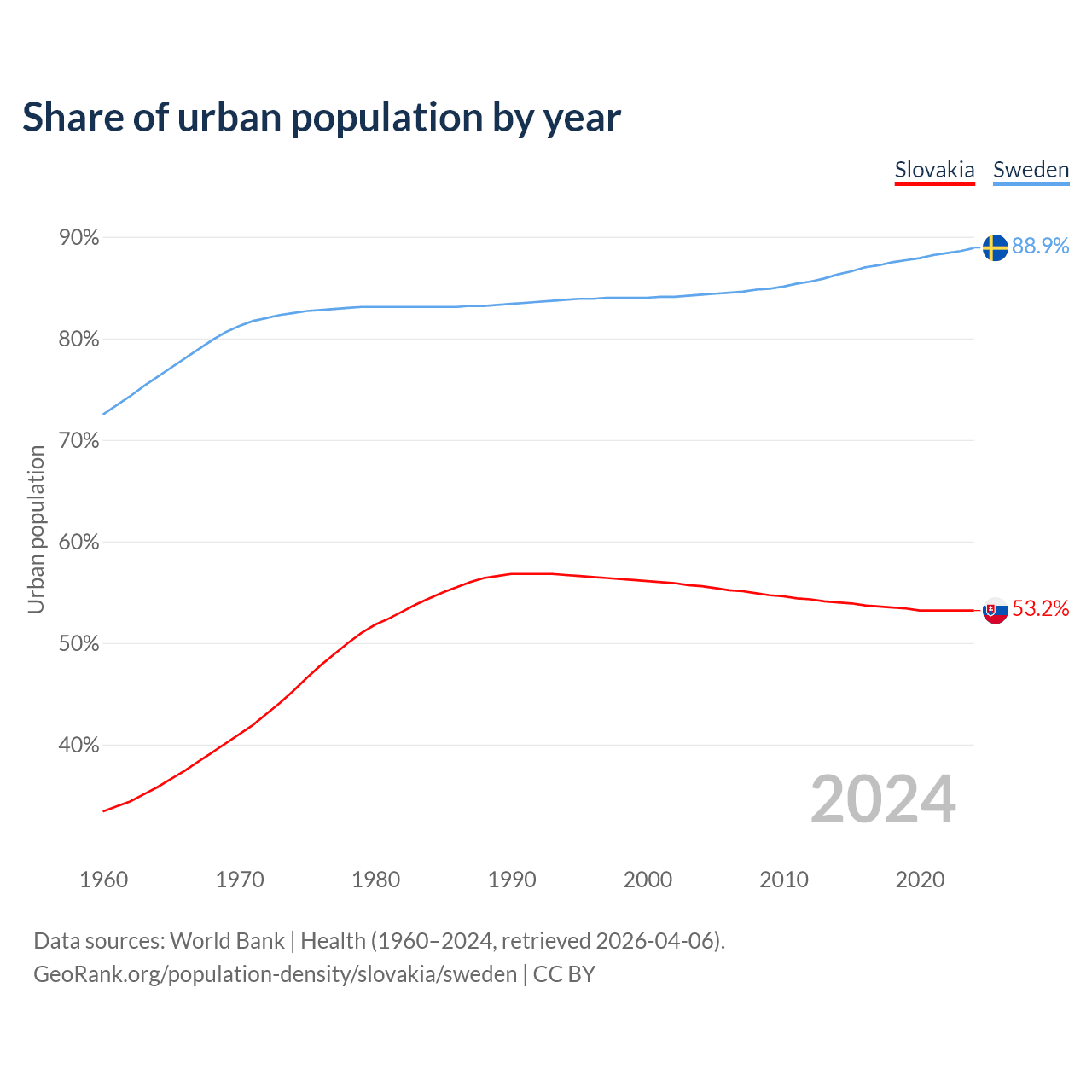 From 2004 to 2024, the share of urban population changed from 55.6% to 53.2% in Slovakia and from 84.3% to 88.9% in Sweden.