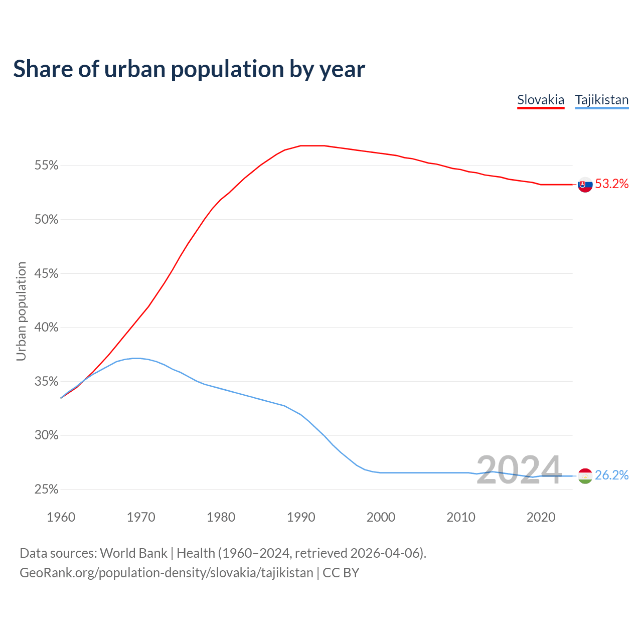 From 2004 to 2024, the share of urban population changed from 55.6% to 53.2% in Slovakia and from 26.5% to 26.2% in Tajikistan.