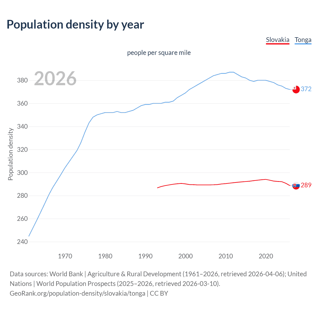 From 2006 to 2026, population density in Slovakia decreased by 0.21%, compared to a 2.77% decline in Tonga.