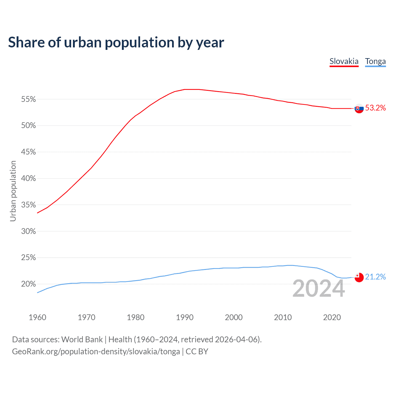From 2004 to 2024, the share of urban population changed from 55.6% to 53.2% in Slovakia and from 23.1% to 21.2% in Tonga.
