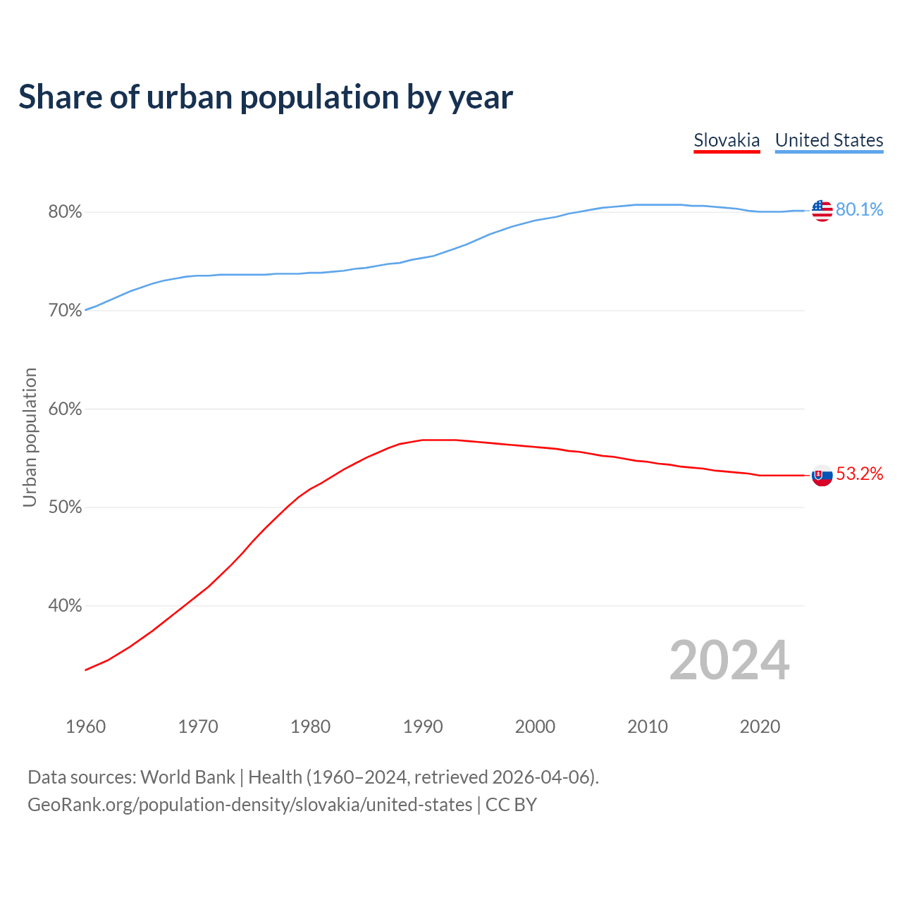 From 2004 to 2024, the share of urban population changed from 55.6% to 53.2% in Slovakia and from 80% to 80.1% in the United States.