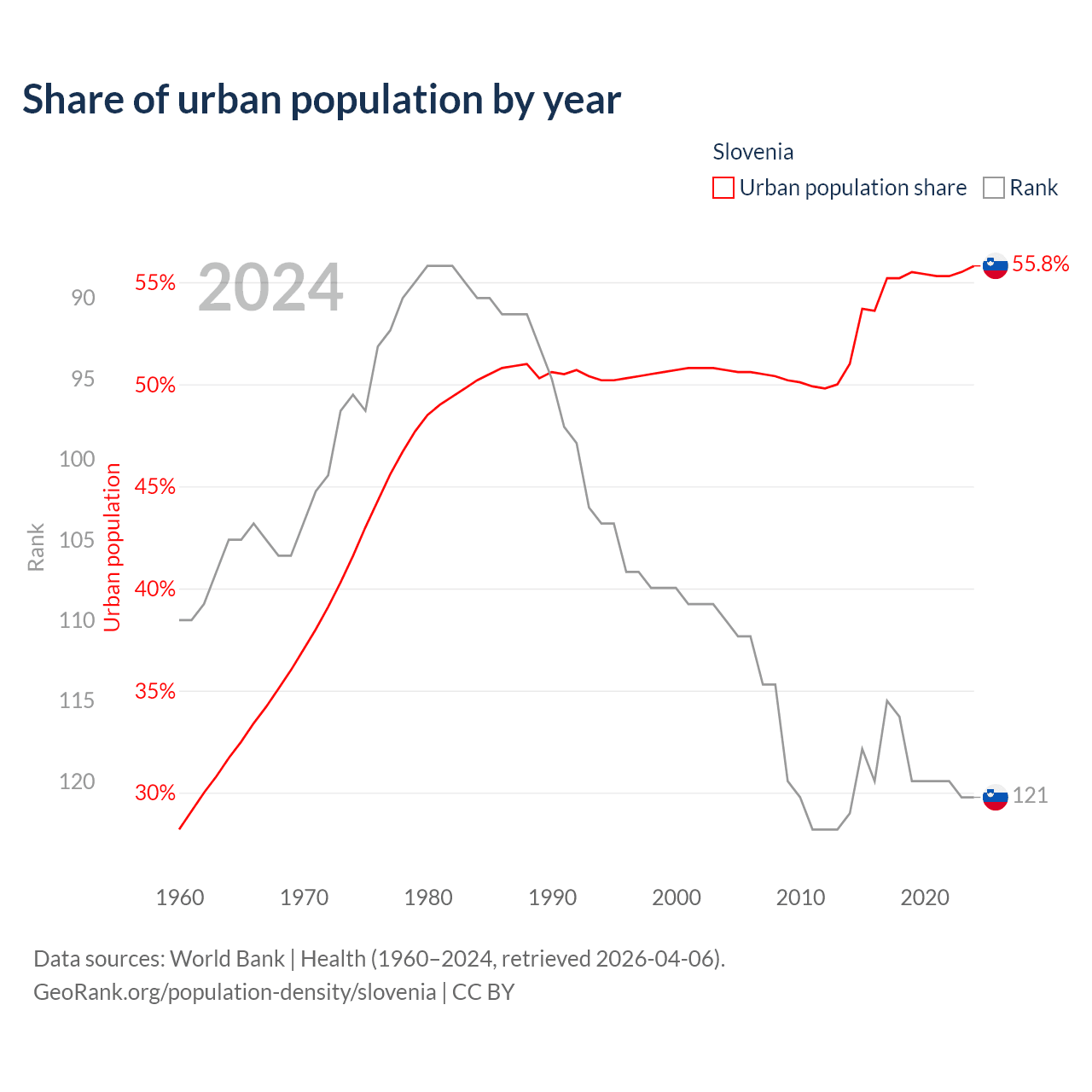 This chart shows the share of urban population in Slovenia from 1960 to 2024: 28.2% lived in urban areas in 1960, 50.7% in 2000, and 55.8% in 2024.