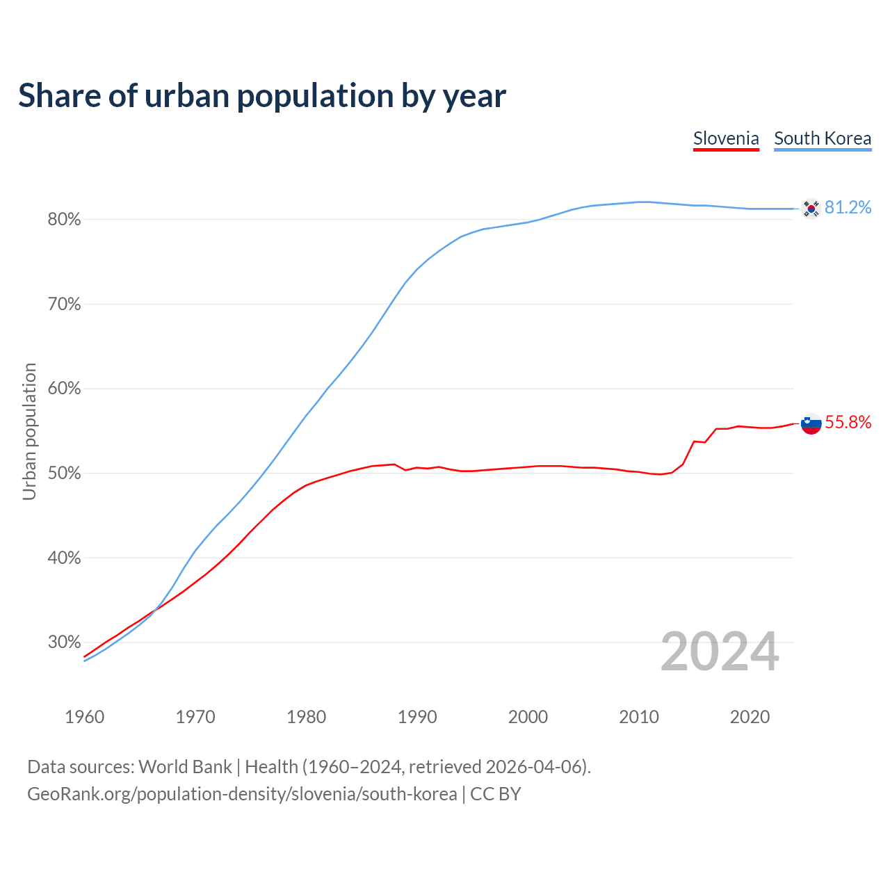 From 2004 to 2024, the share of urban population changed from 50.7% to 55.8% in Slovenia and from 81.1% to 81.2% in South Korea.