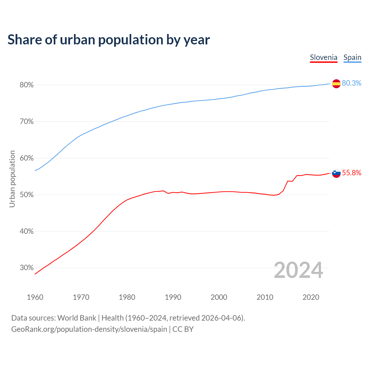 From 2004 to 2024, the share of urban population changed from 50.7% to 55.8% in Slovenia and from 77% to 80.3% in Spain.