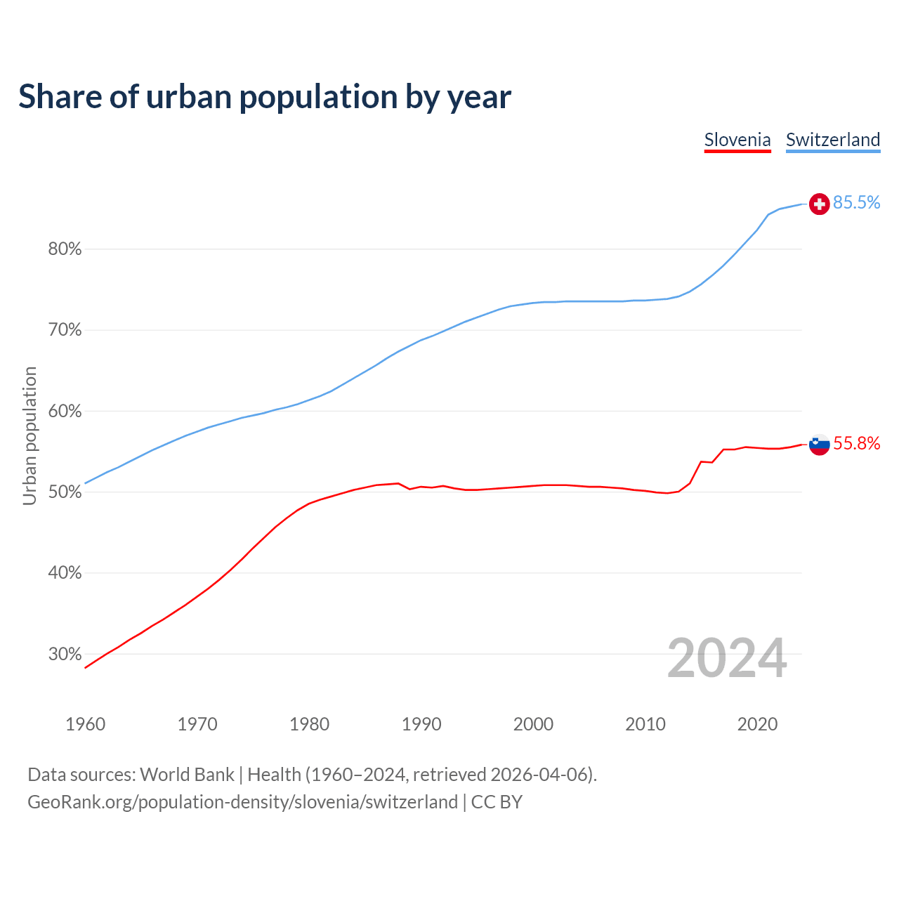 From 2004 to 2024, the share of urban population changed from 50.7% to 55.8% in Slovenia and from 73.5% to 85.5% in Switzerland.