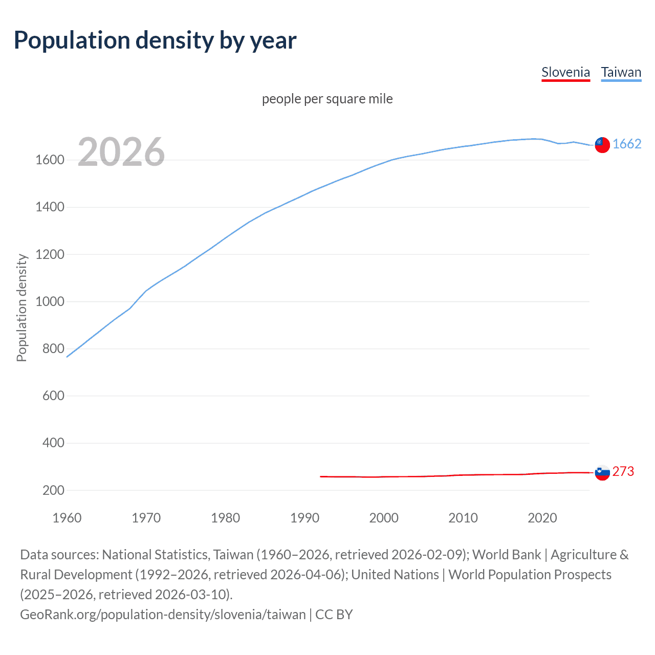 From 2006 to 2026, population density in Slovenia increased by 5.87%, compared to a 1.78% growth in Taiwan.