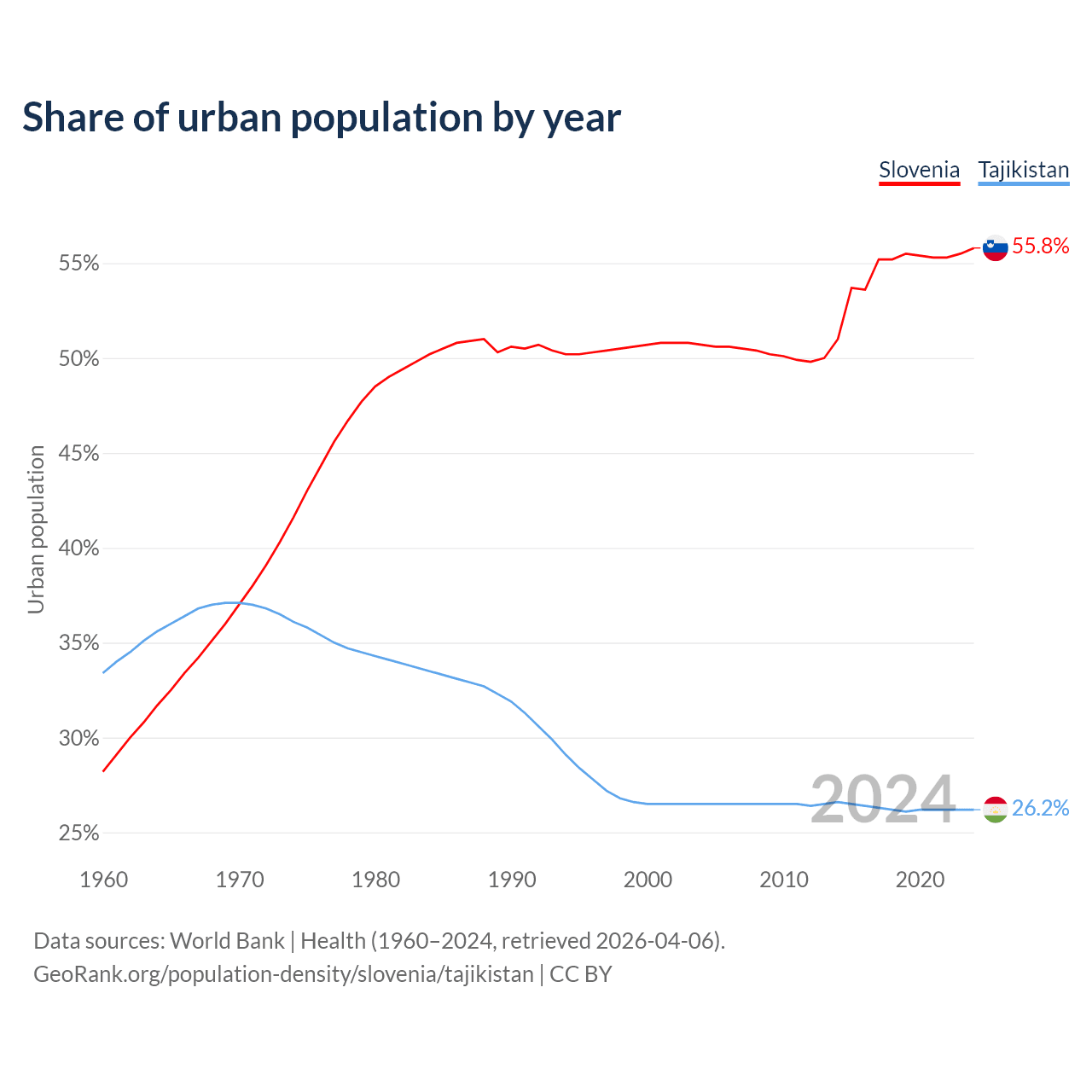From 2004 to 2024, the share of urban population changed from 50.7% to 55.8% in Slovenia and from 26.5% to 26.2% in Tajikistan.