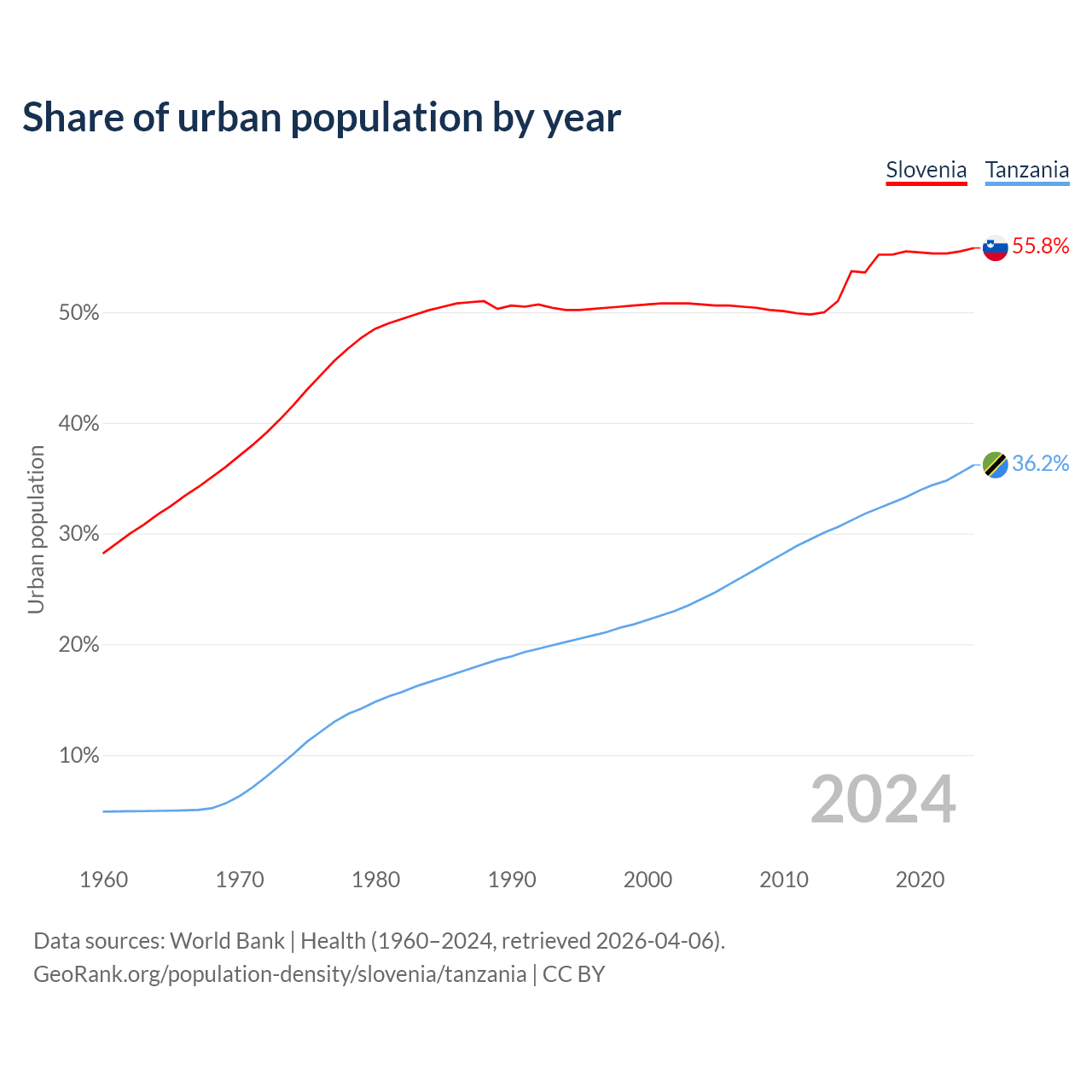 From 2004 to 2024, the share of urban population changed from 50.7% to 55.8% in Slovenia and from 24.1% to 36.2% in Tanzania.