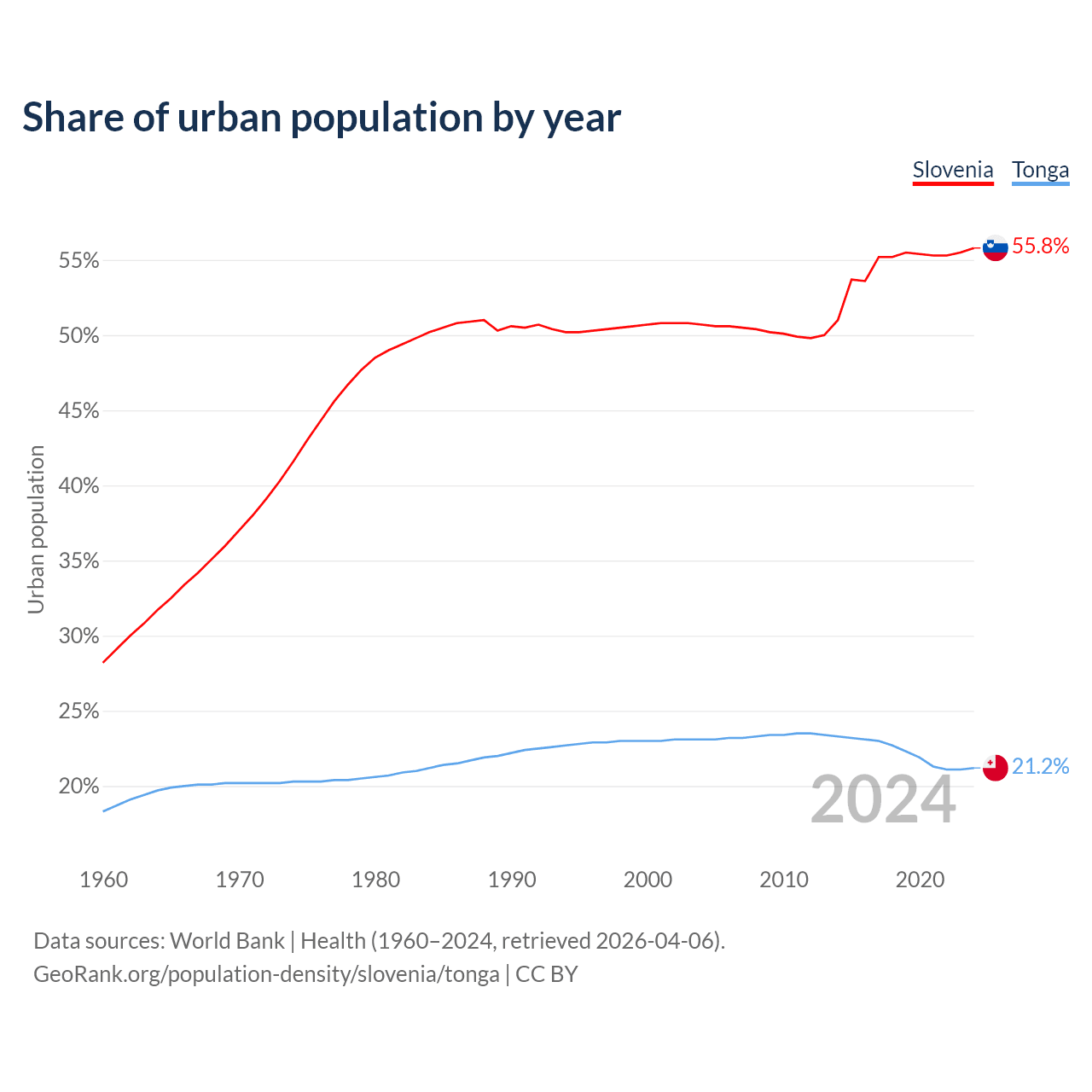 From 2004 to 2024, the share of urban population changed from 50.7% to 55.8% in Slovenia and from 23.1% to 21.2% in Tonga.