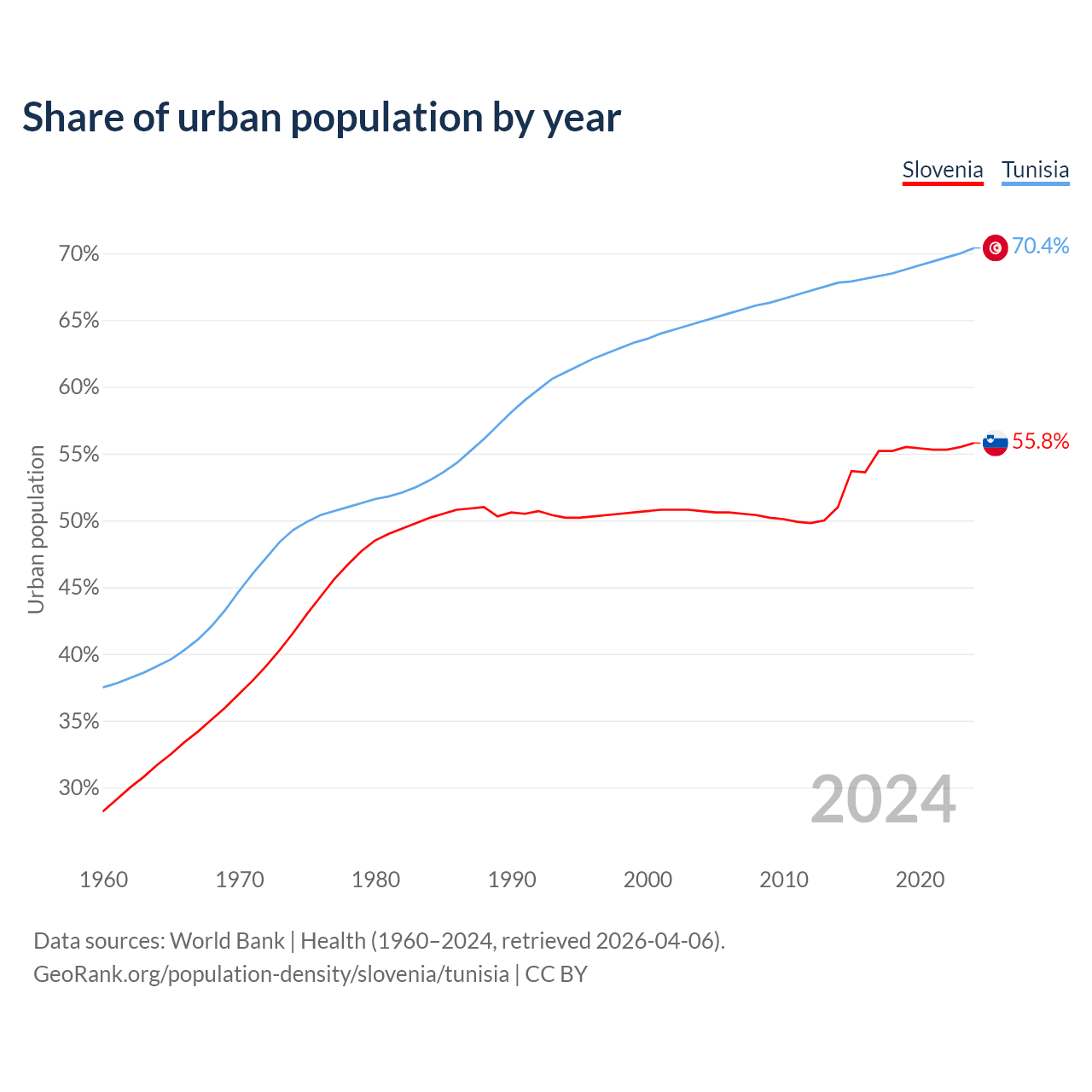 From 2004 to 2024, the share of urban population changed from 50.7% to 55.8% in Slovenia and from 64.9% to 70.4% in Tunisia.