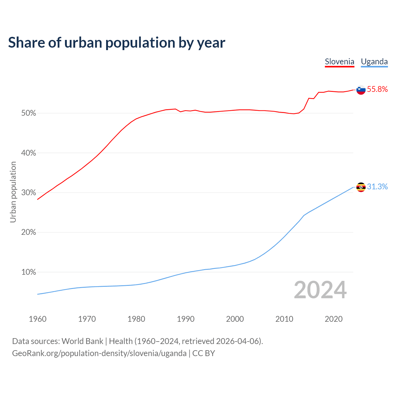 From 2004 to 2024, the share of urban population changed from 50.7% to 55.8% in Slovenia and from 13.1% to 31.3% in Uganda.