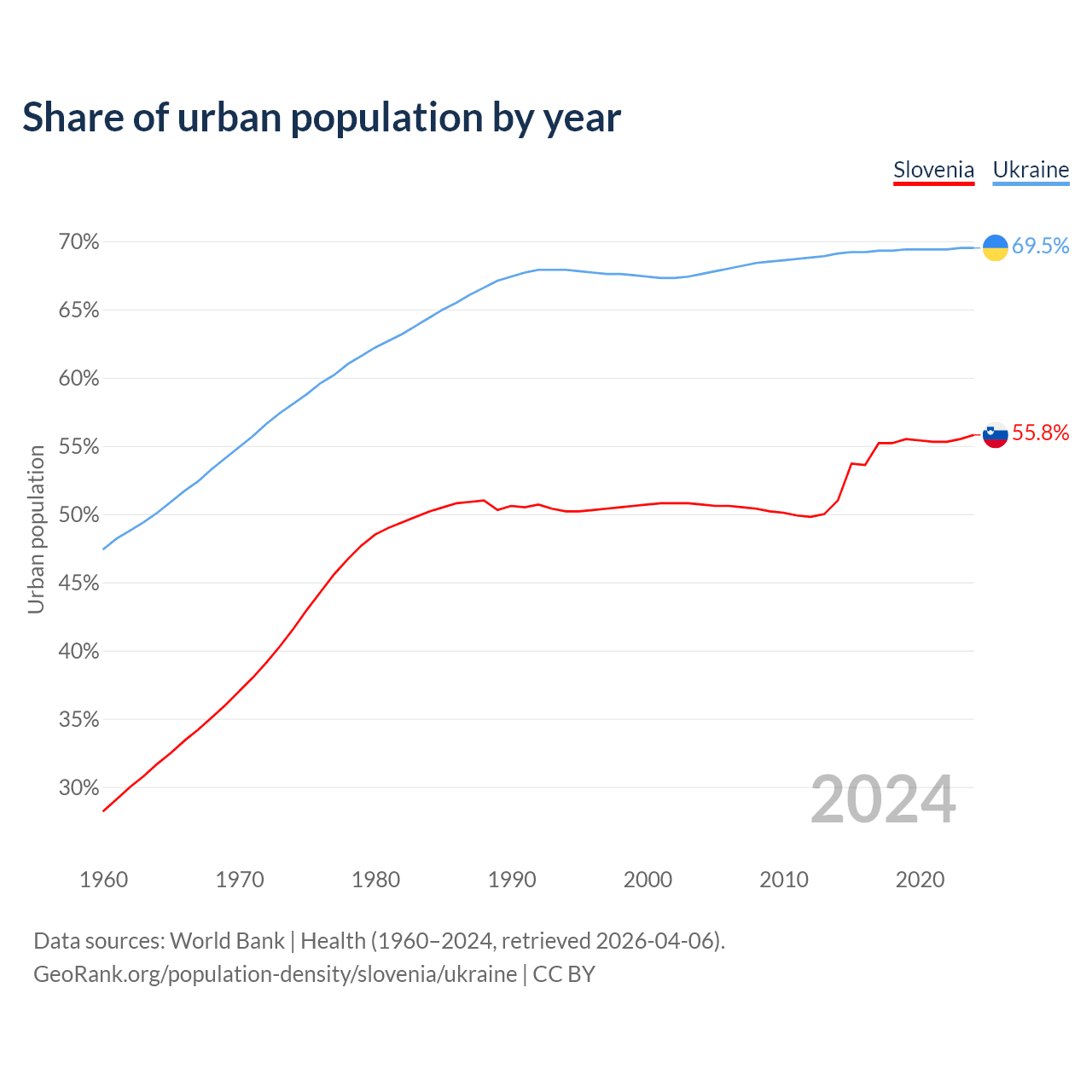 From 2004 to 2024, the share of urban population changed from 50.7% to 55.8% in Slovenia and from 67.6% to 69.5% in Ukraine.