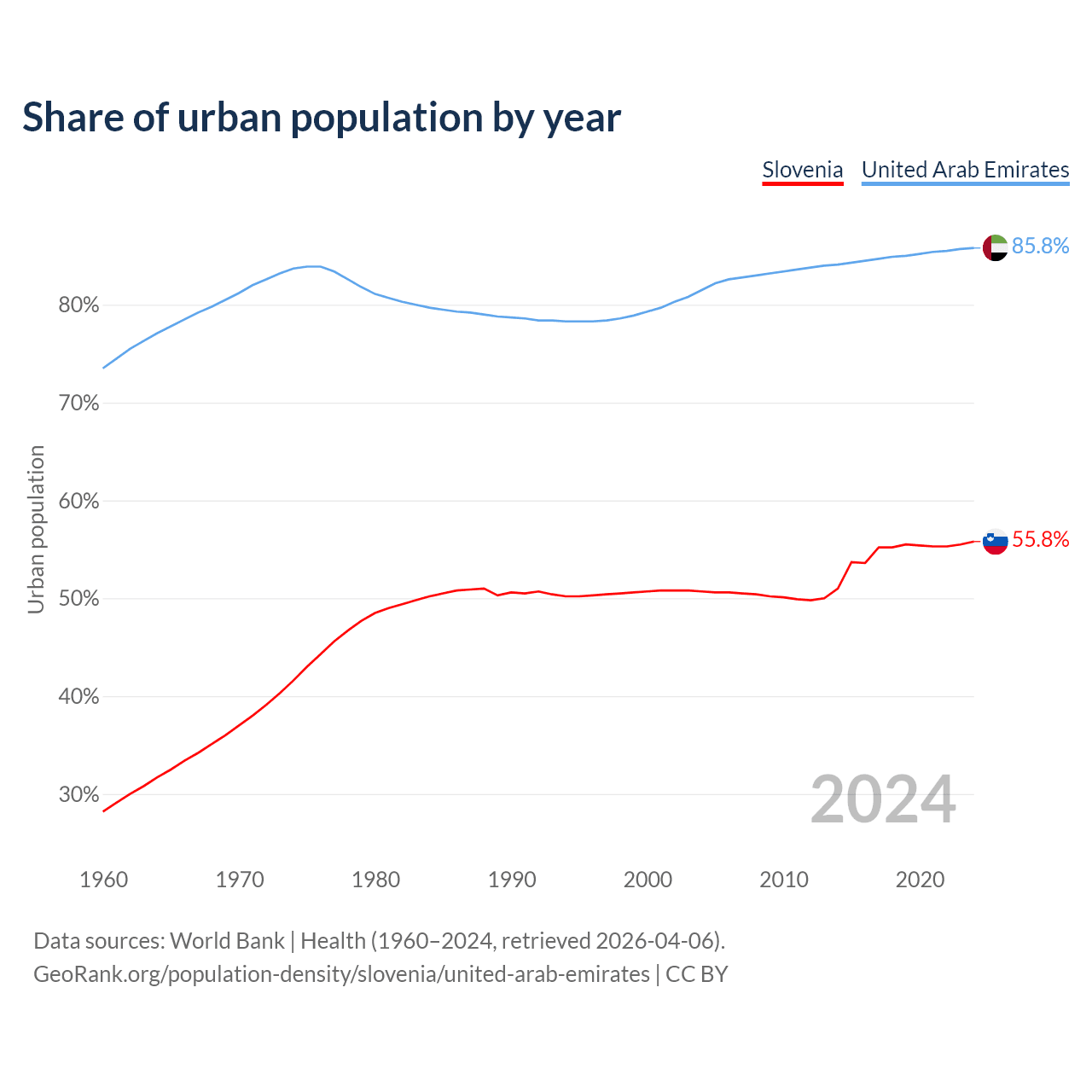 From 2004 to 2024, the share of urban population changed from 50.7% to 55.8% in Slovenia and from 81.5% to 85.8% in the United Arab Emirates.